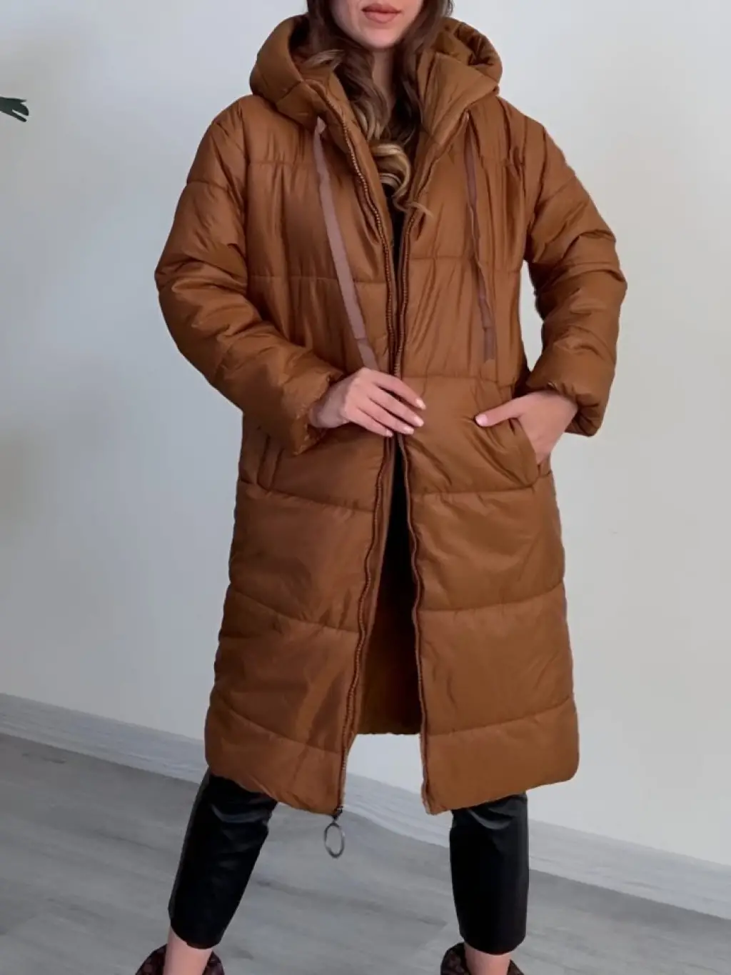 Kapşonlu Bağcık Detaylı Fermuarlı Şişme Mont -Taba