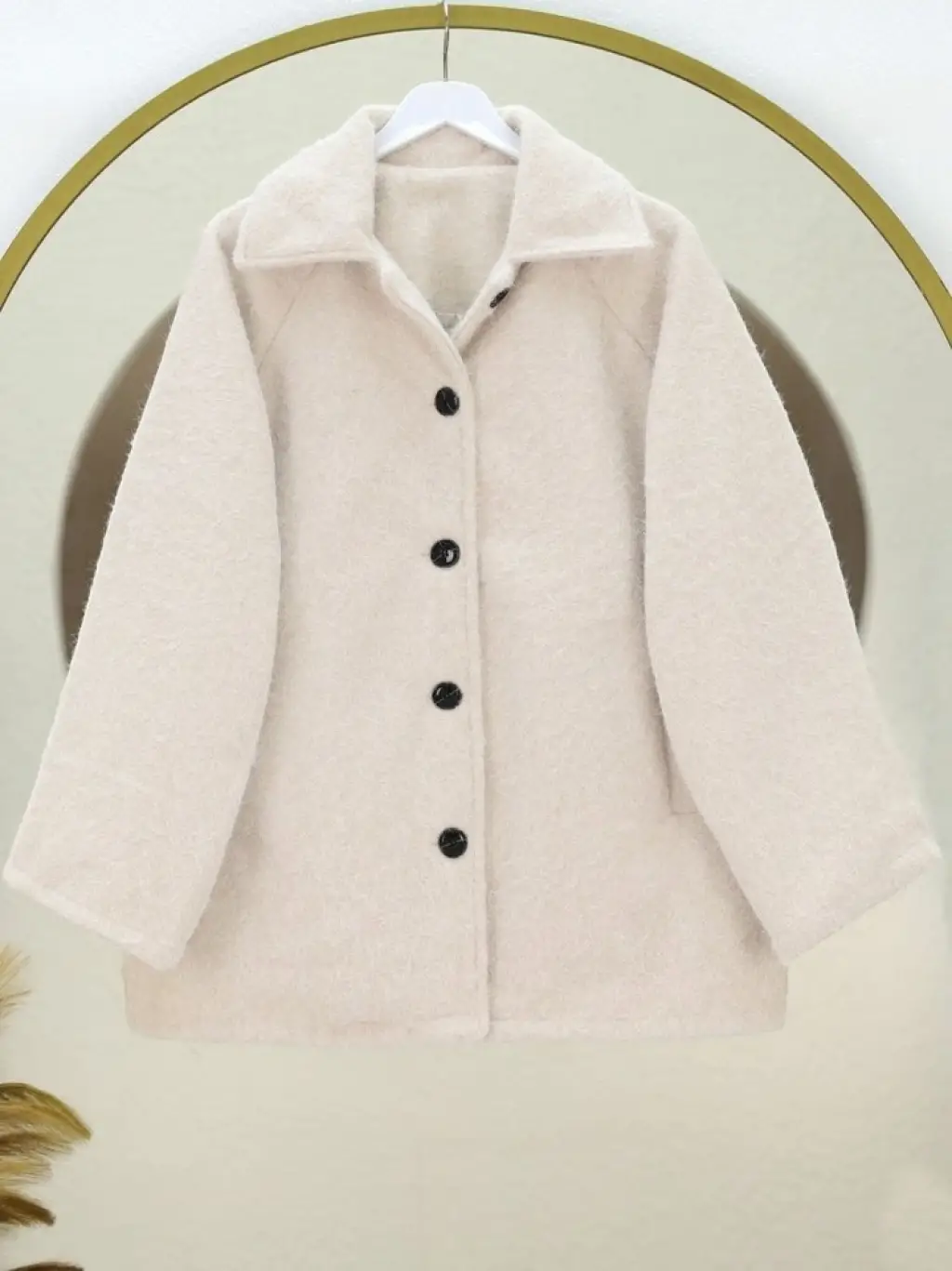Çift Cepli Önü Düğmeli Astarlı Buklet Kaban -Ekru