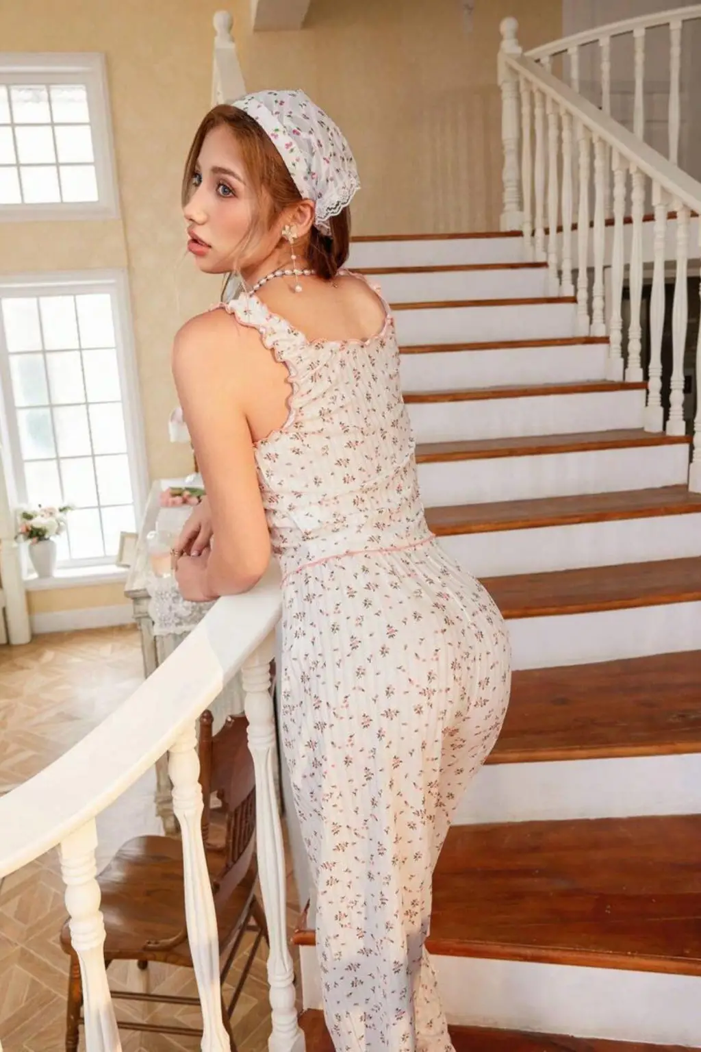 Ekru Yaz Romantizmi Askılı Pijama Takımı 7359