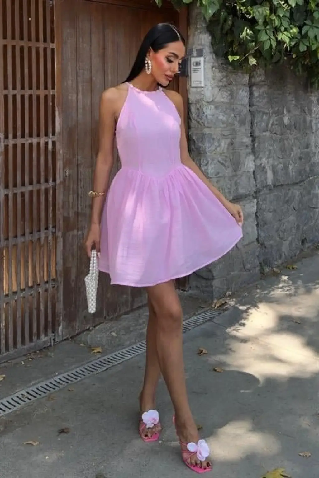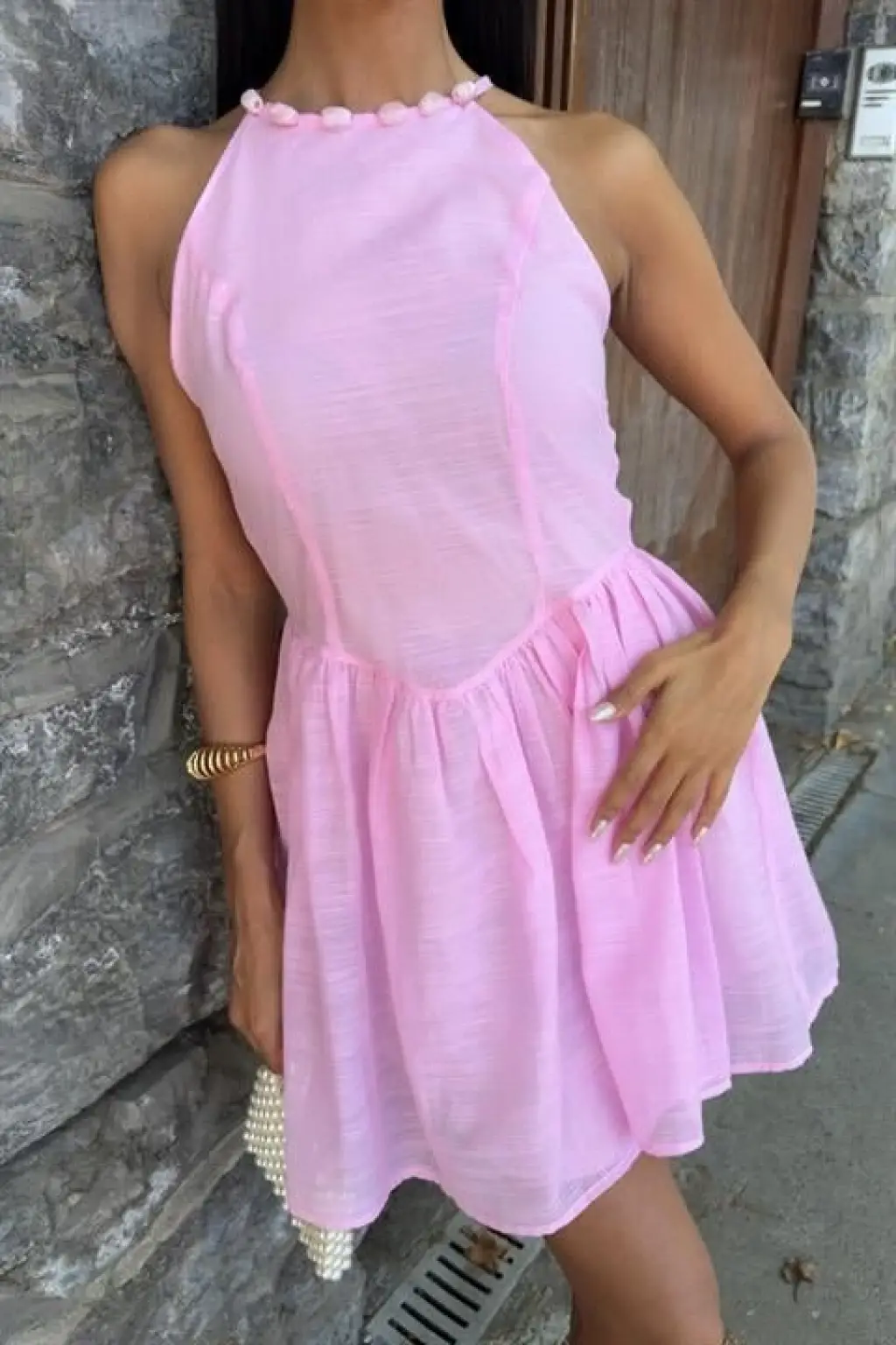 Kadın Kolsuz Omzu Volanlı Bisiklet Yaka Kaşkorse Mini Elbise