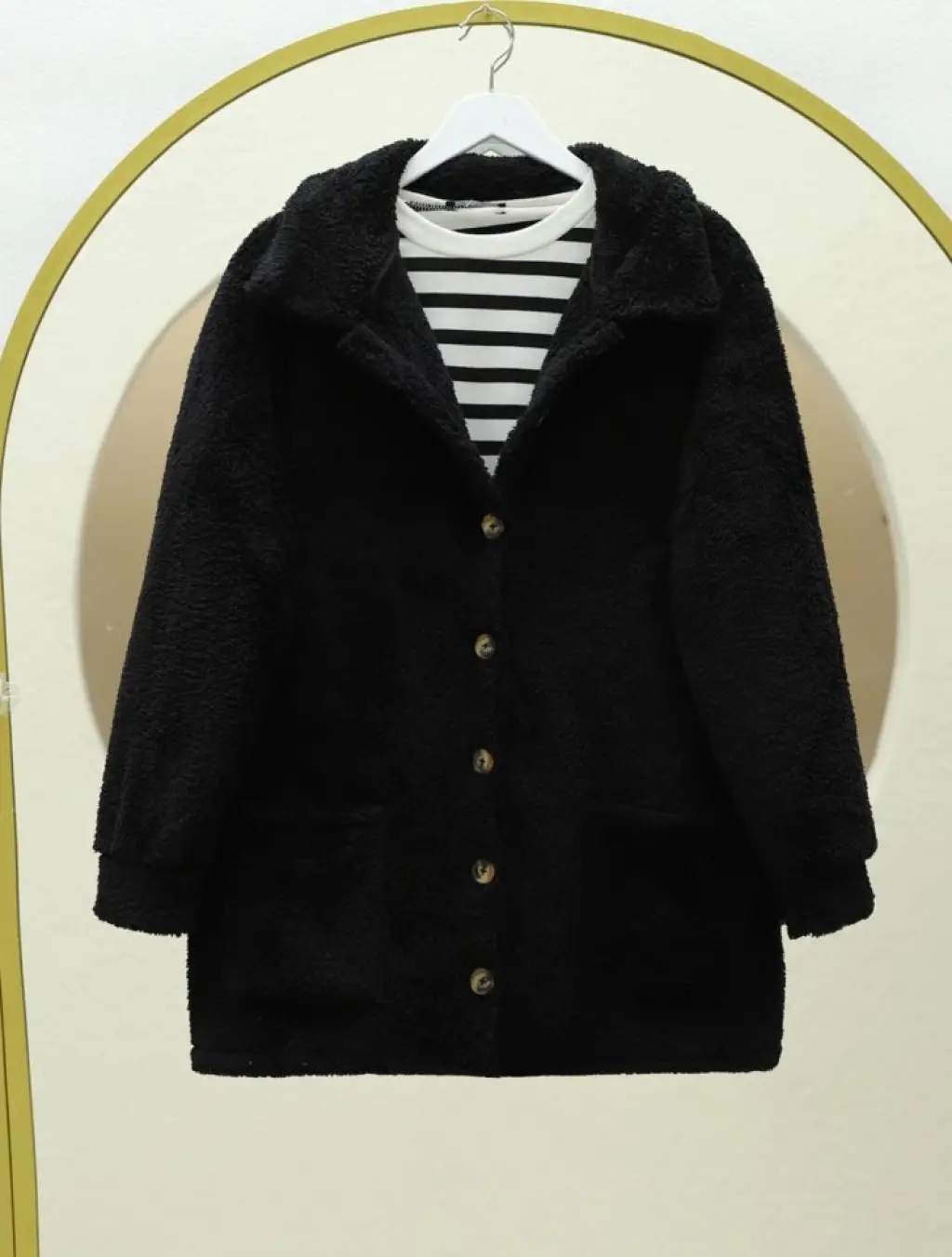 Siyah Boydan Düğmeli Cepli Pelüş Ceket
