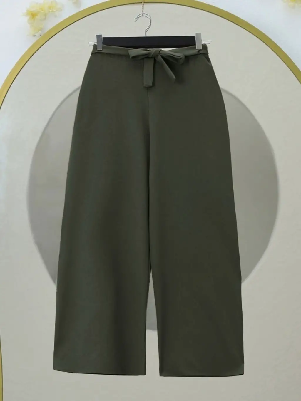 Beli Lastikli Bağlamalı Bol Paça Pantolon -Haki