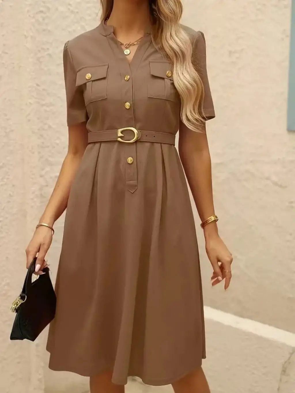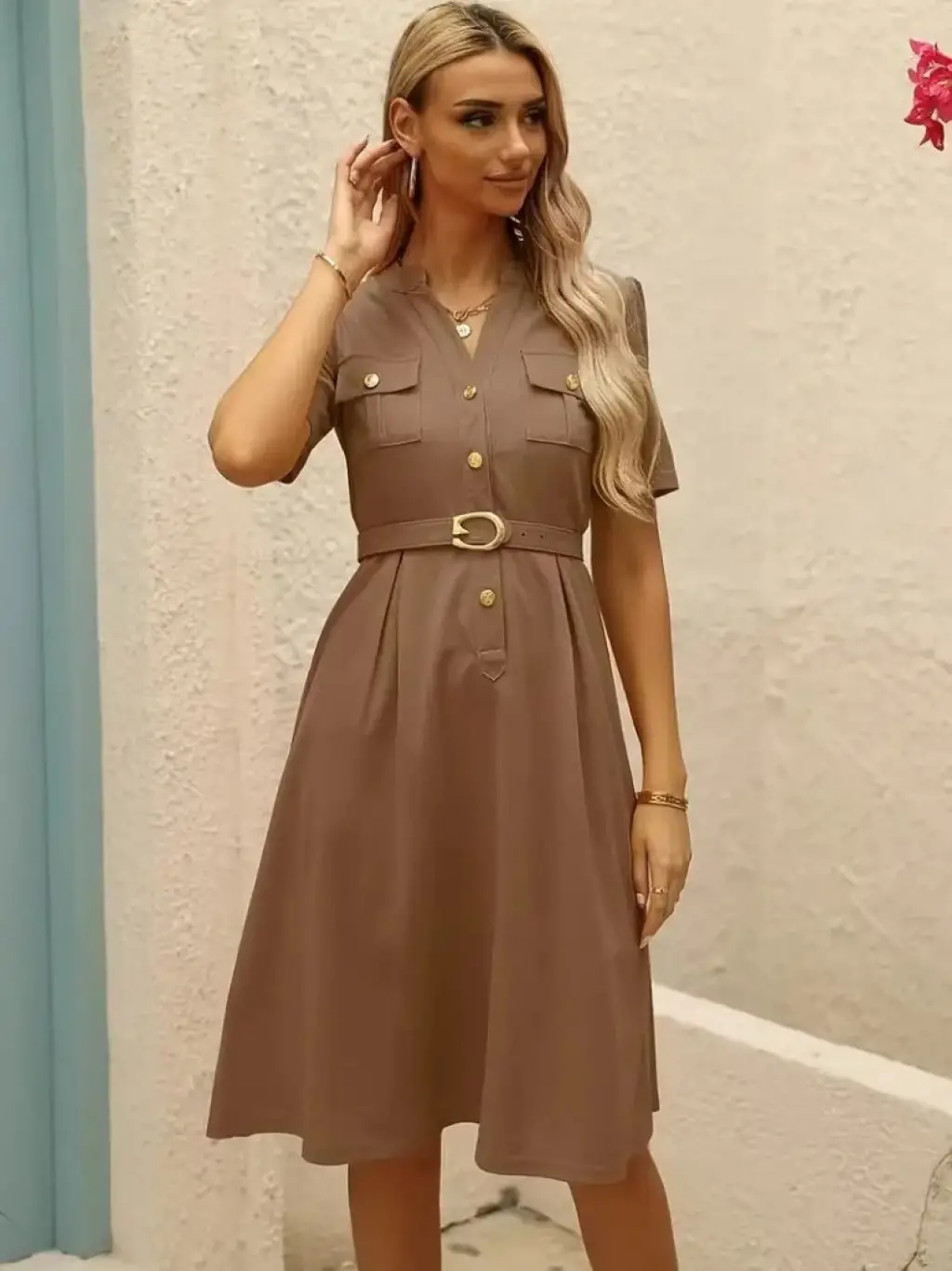 Kadın Kısa Kollu Düğmeli Ve Kemerli Atlas Elbise