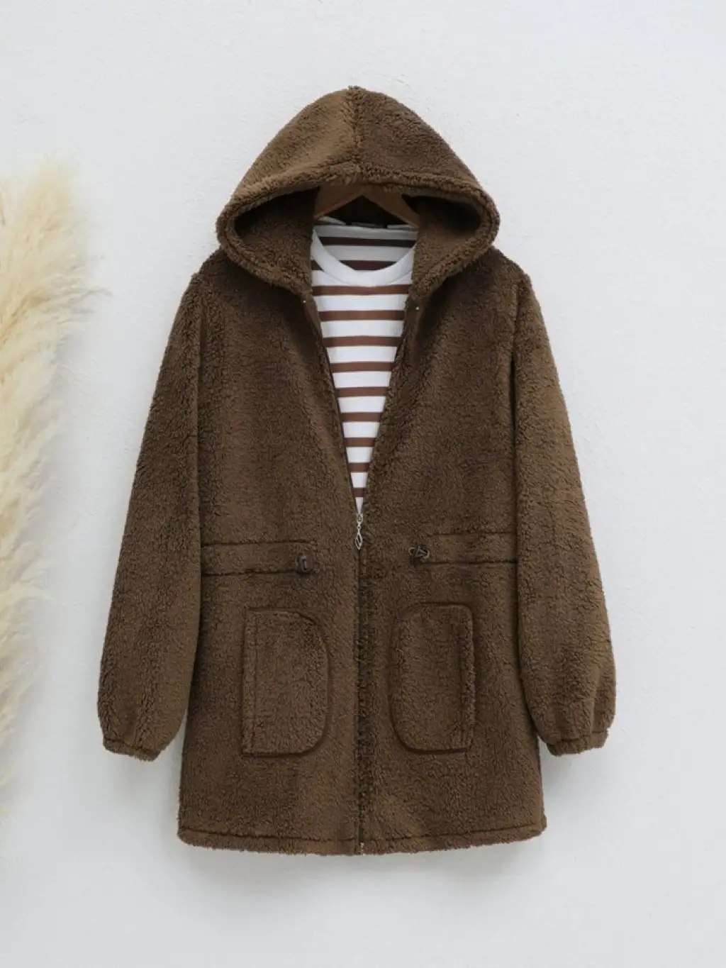 Kahve Beli Lastikli Kapşonlu Fermuarlı Peluş Mont Kadın Giyim