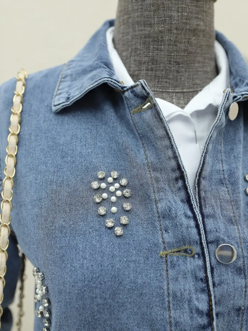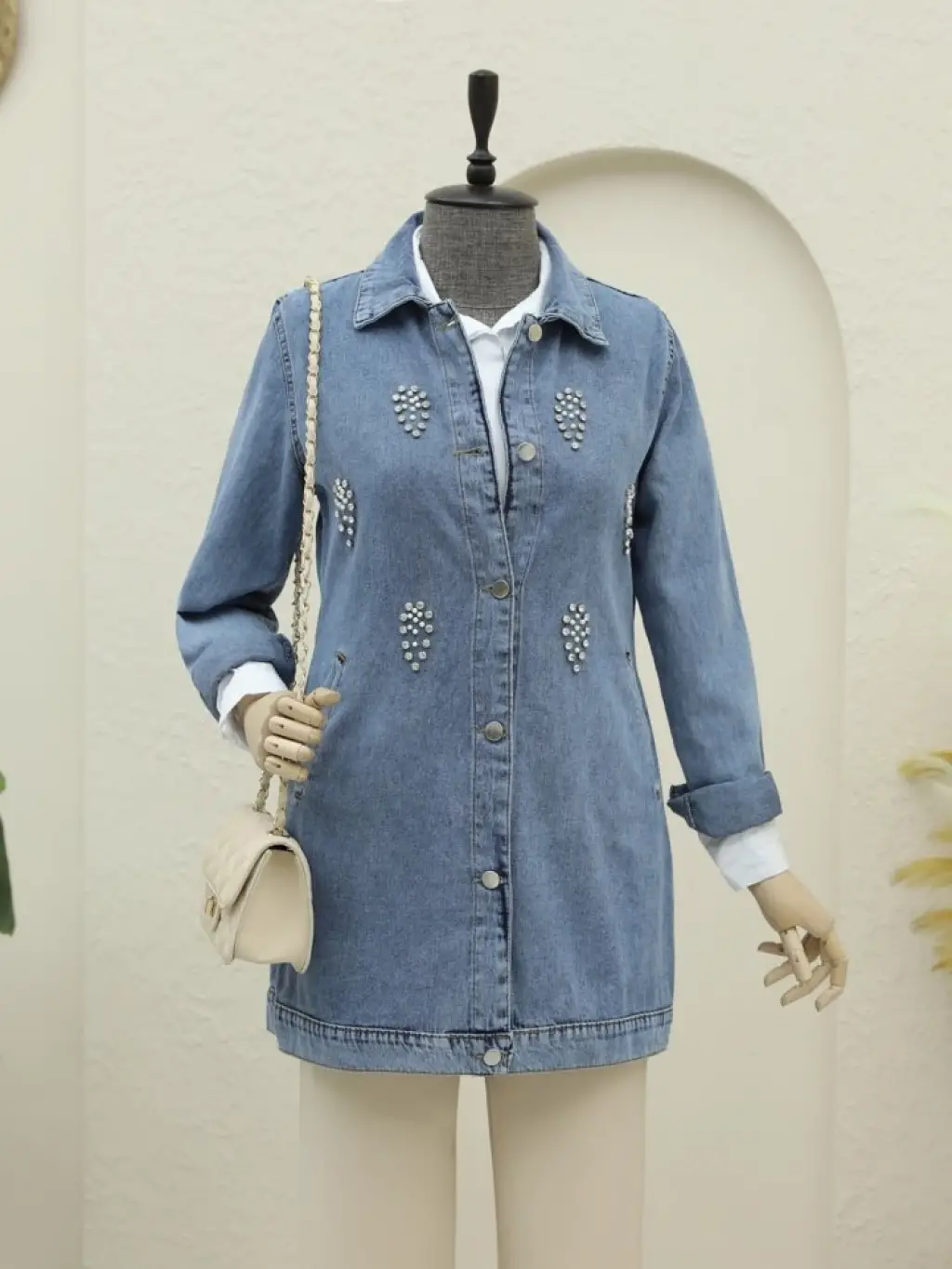 Küme Taş Detaylı Düğmeli Kot Ceket -Buz Mavi