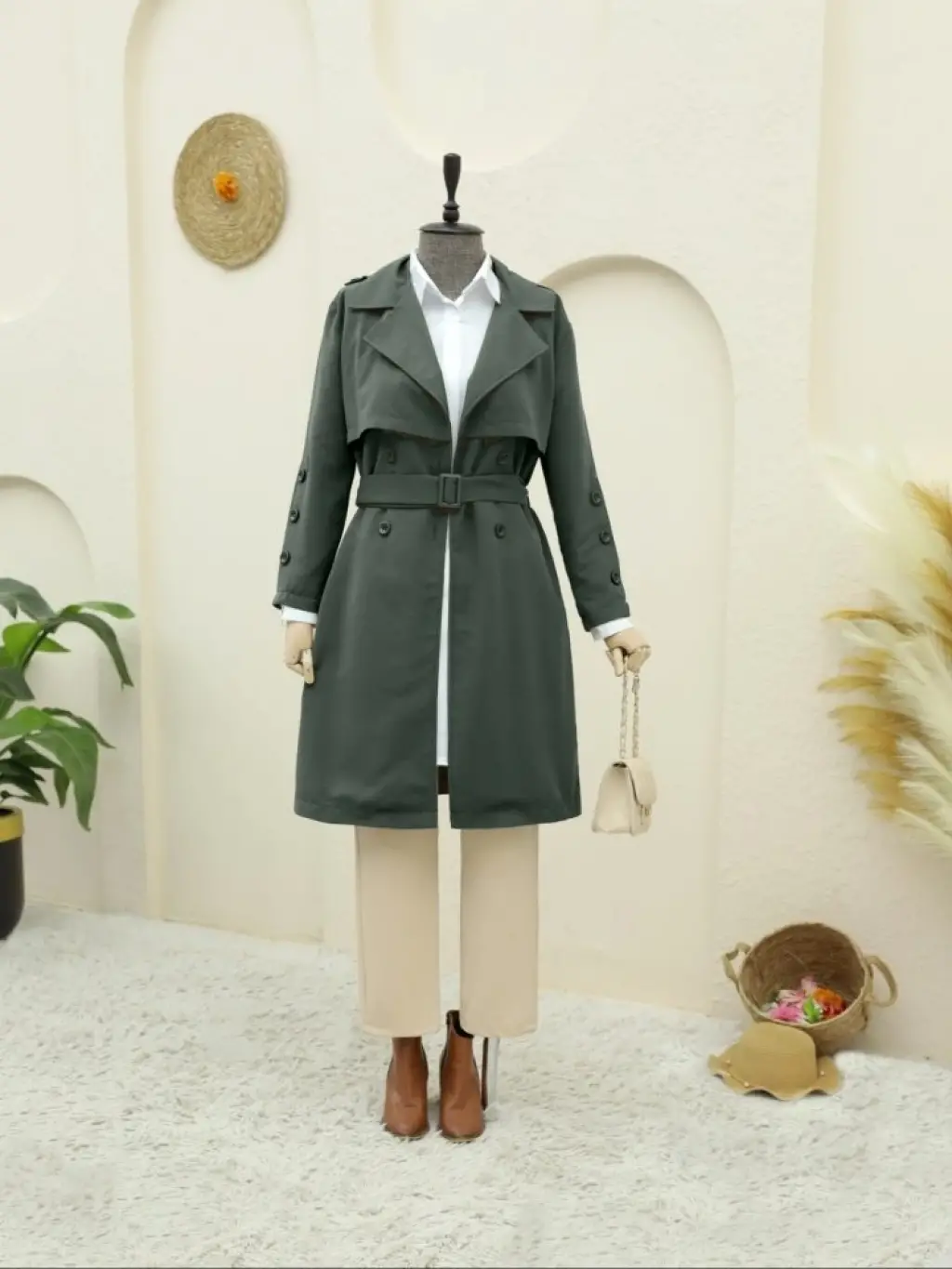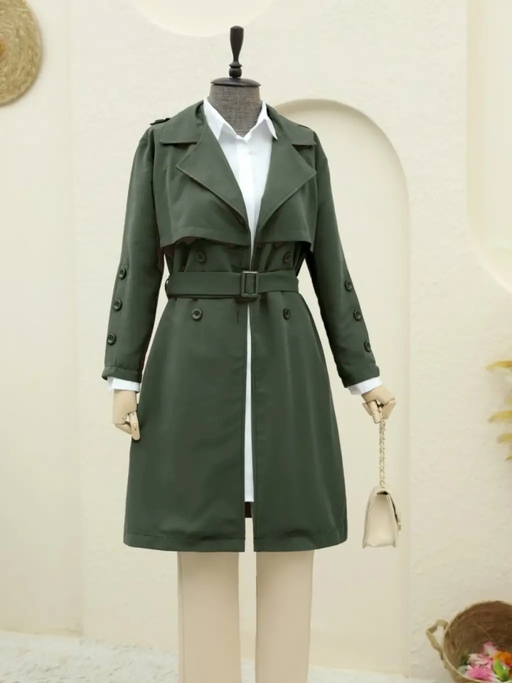 Düğmeli Kemerli Ara Boy Trençkot -Haki