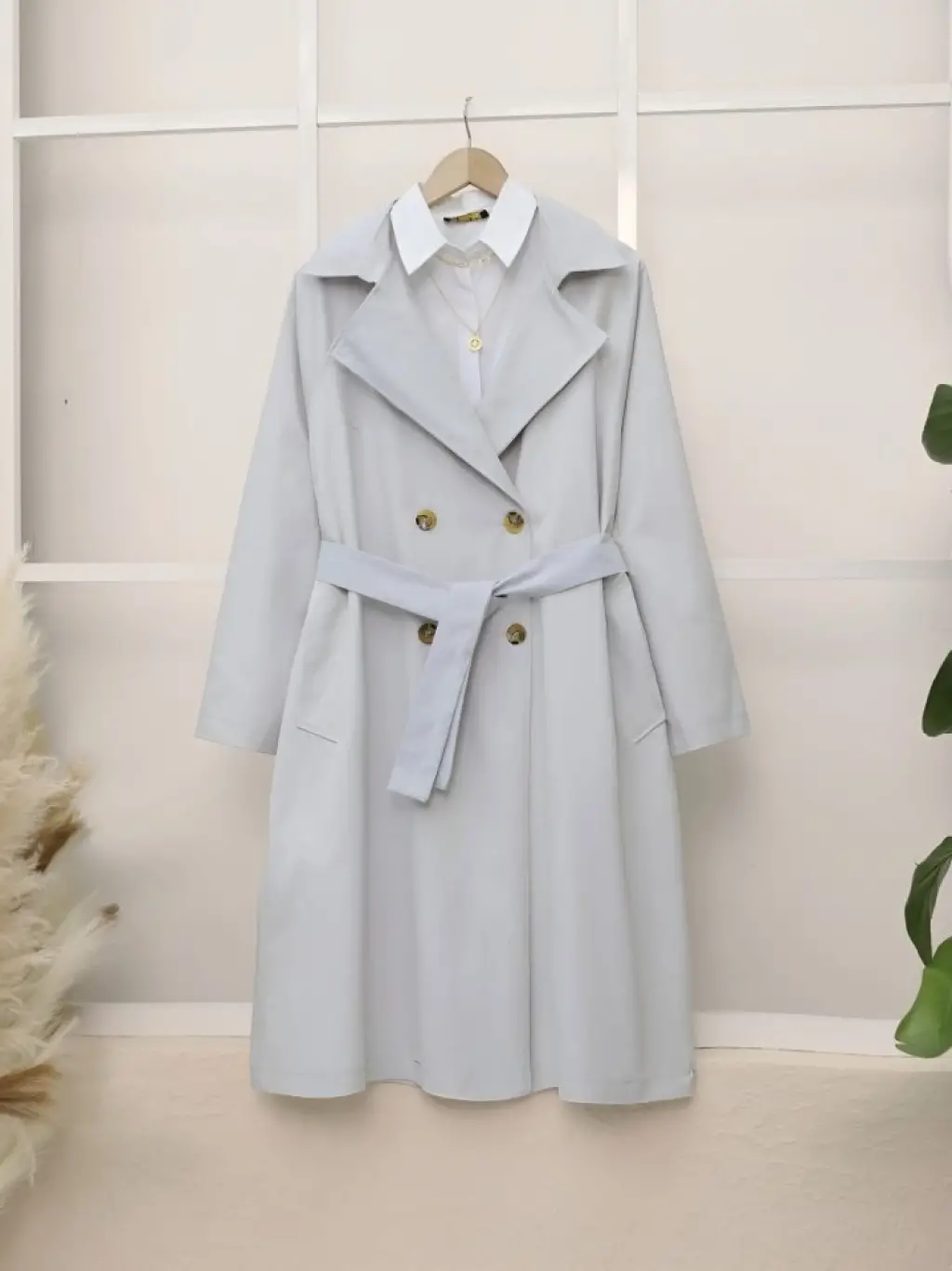 Broş Düğmeli Çift Düğmeli Kemerli Trençkot -Bej