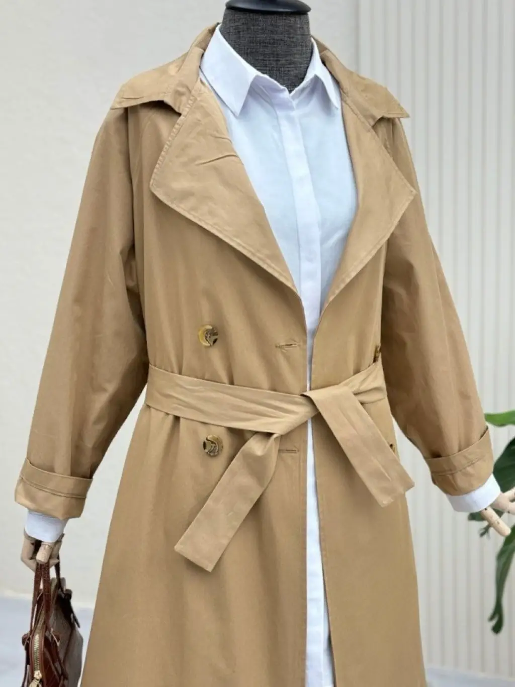 Broş Düğmeli Çift Düğmeli Kemerli Trençkot -Bej