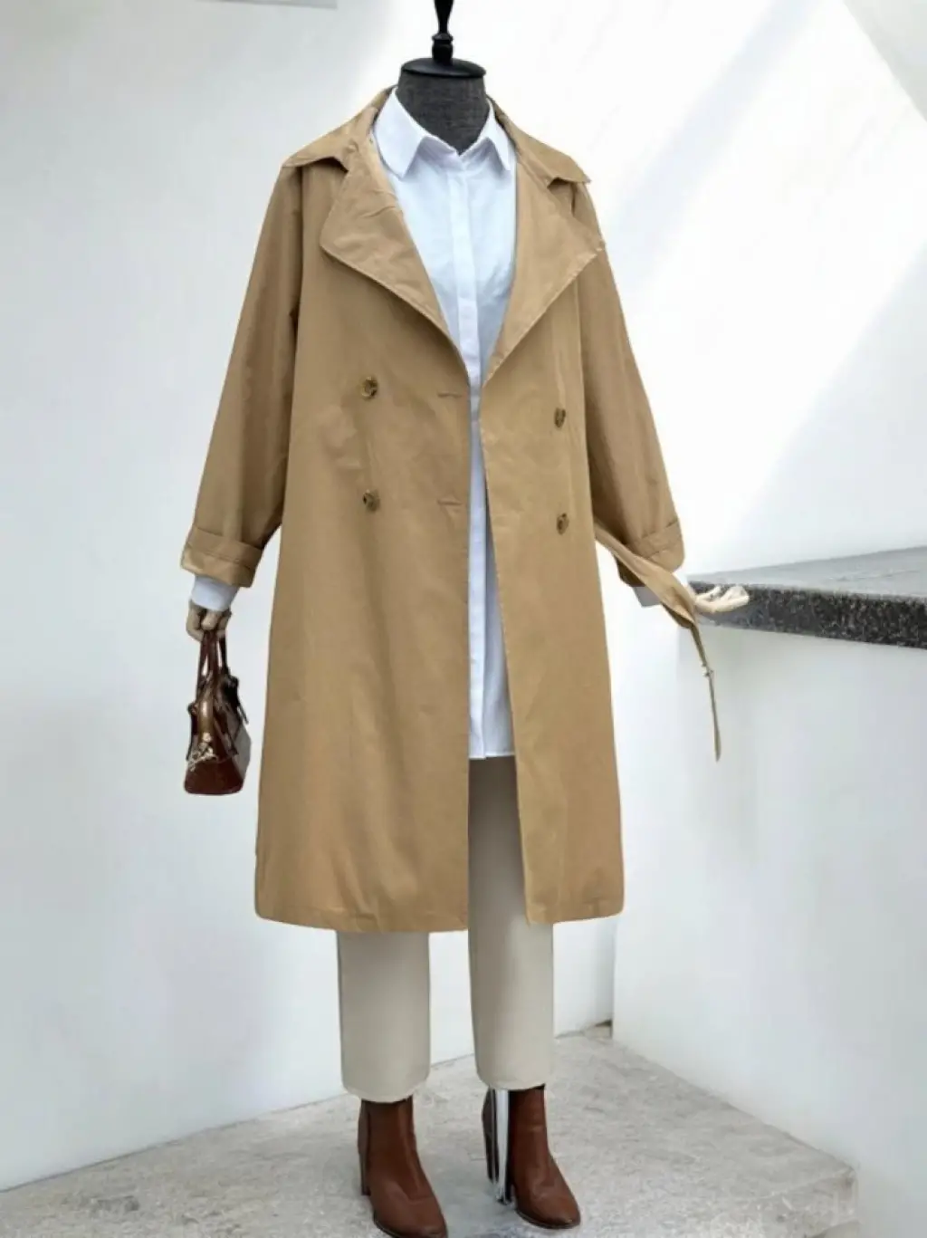 Düğmeli Kemerli Ara Boy Trençkot -Taba