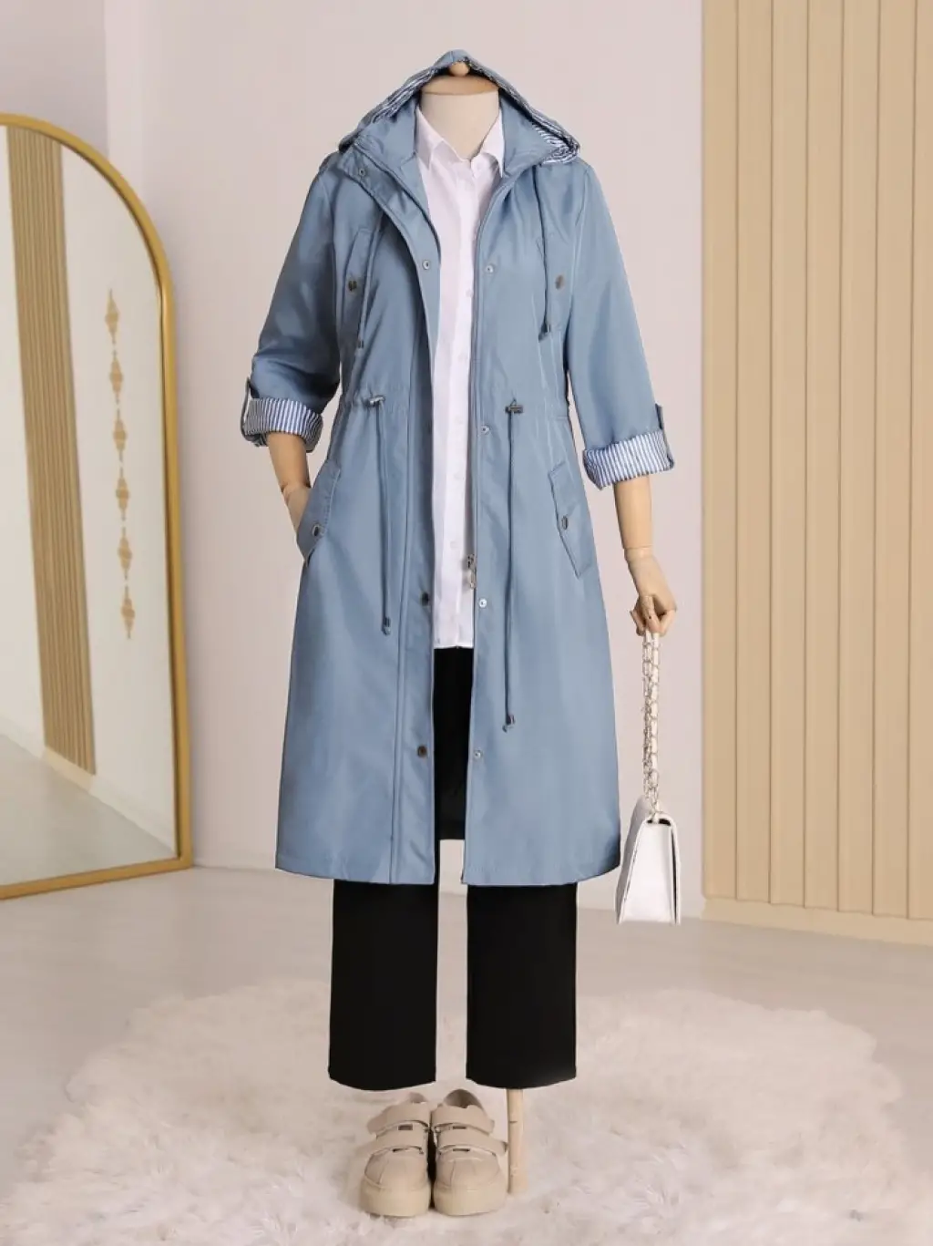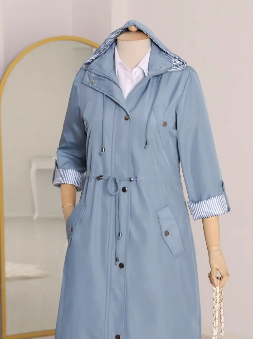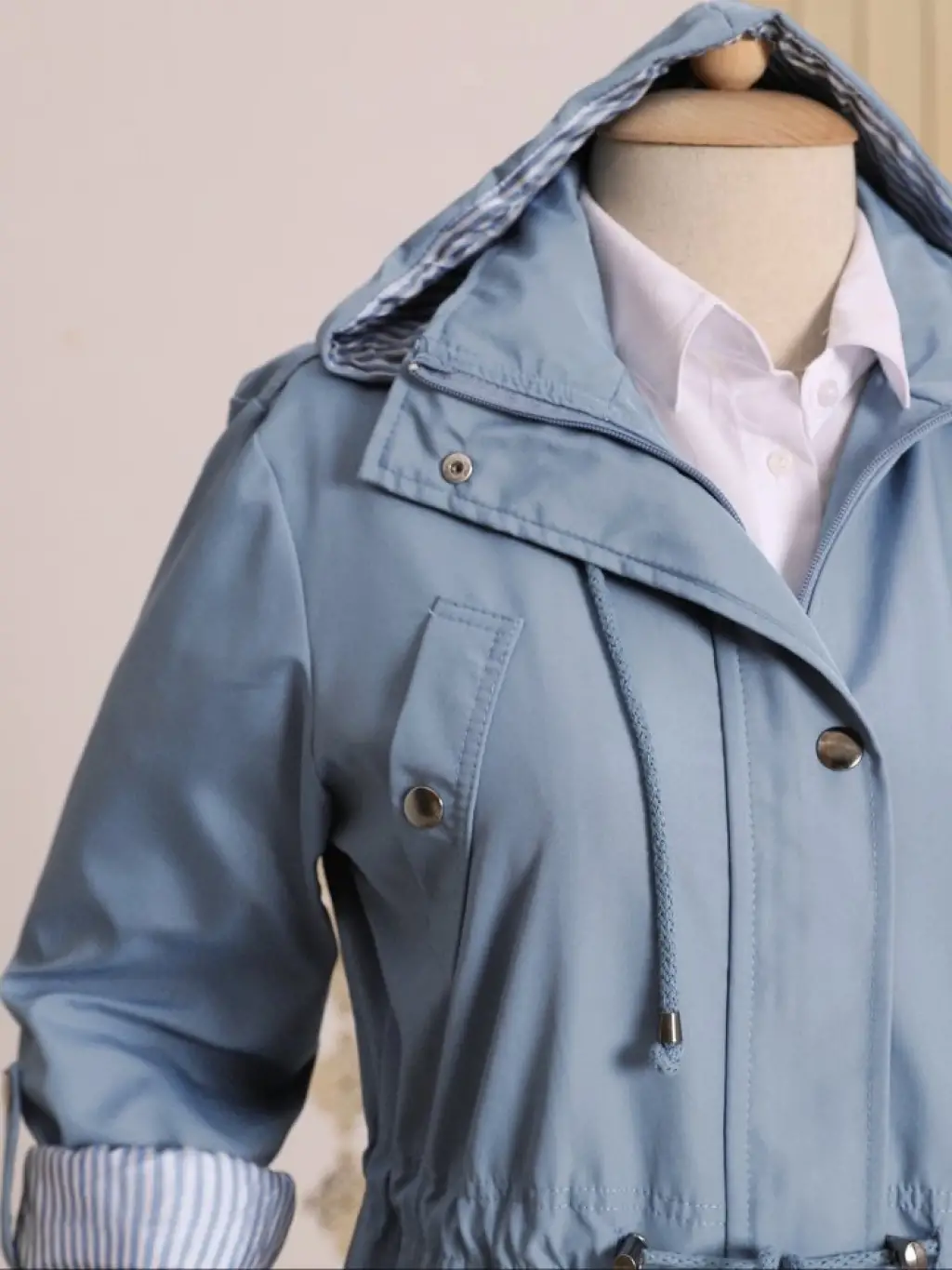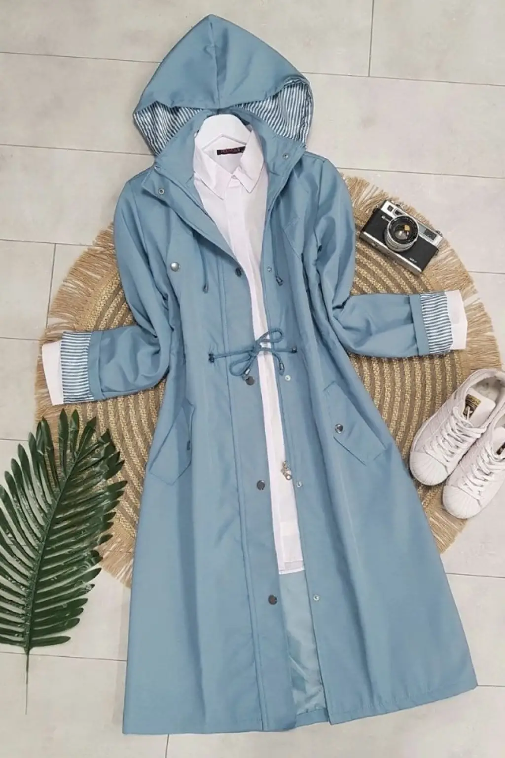 Astarı Çizgili Trençkot -Mavi