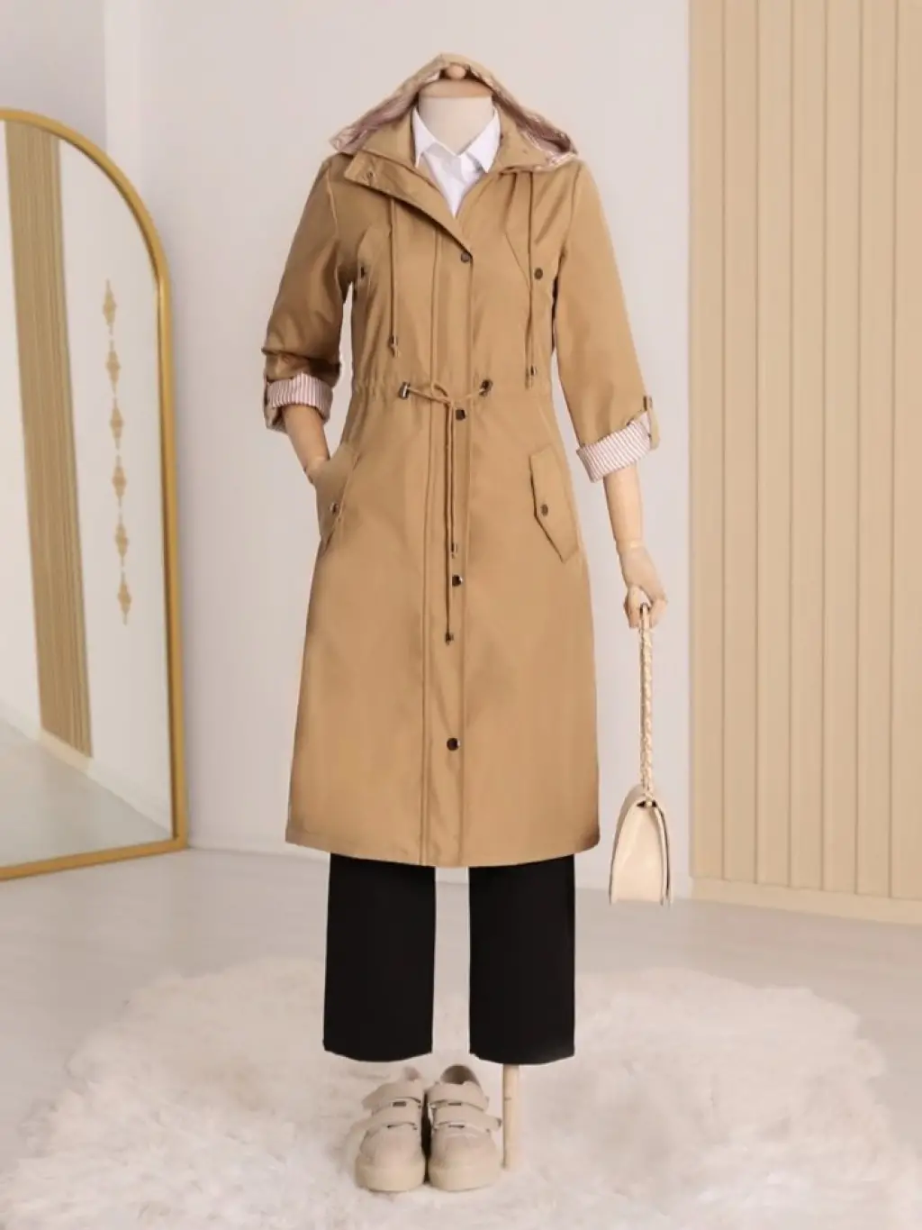 Düğmeli Kemerli Ara Boy Trençkot -Taba