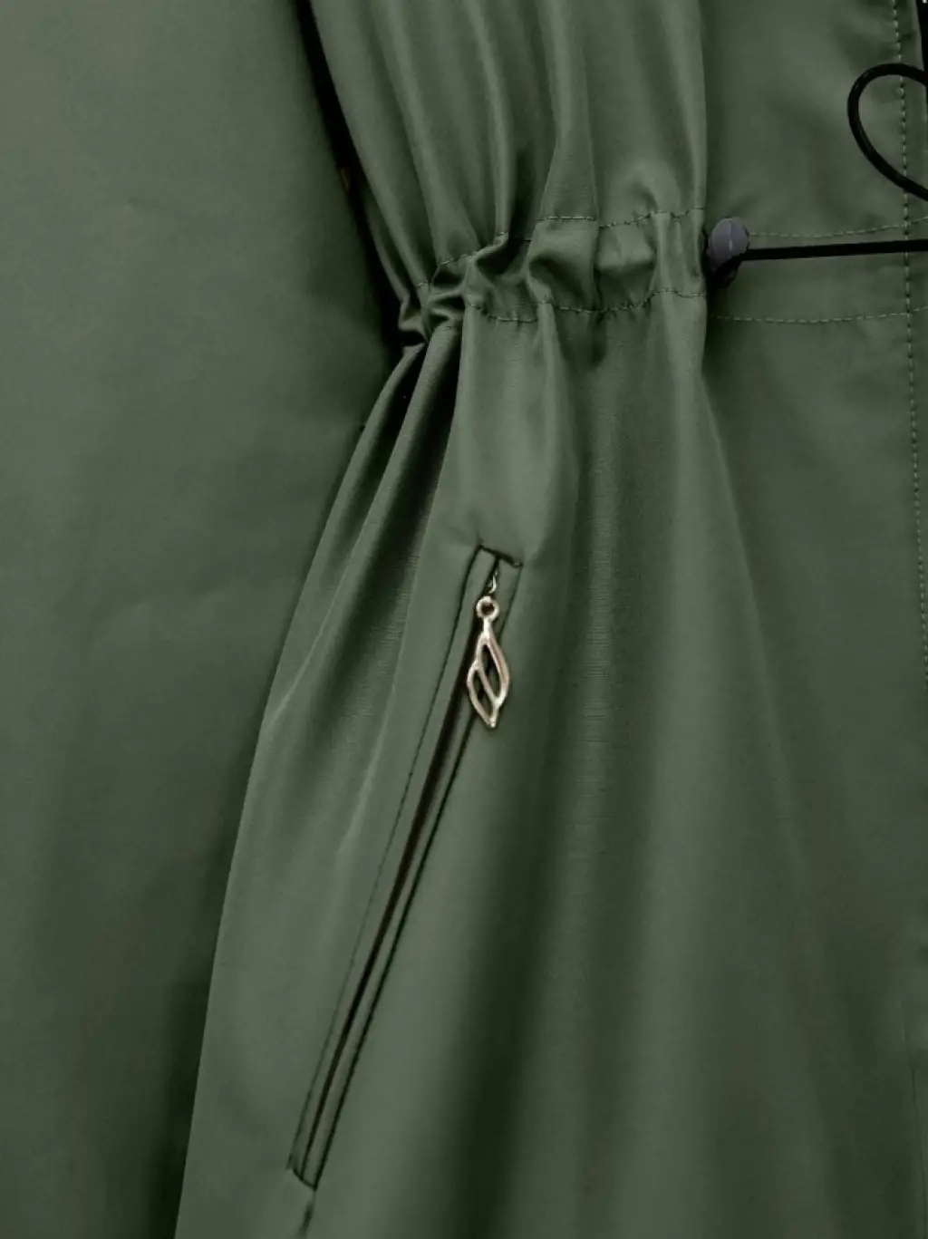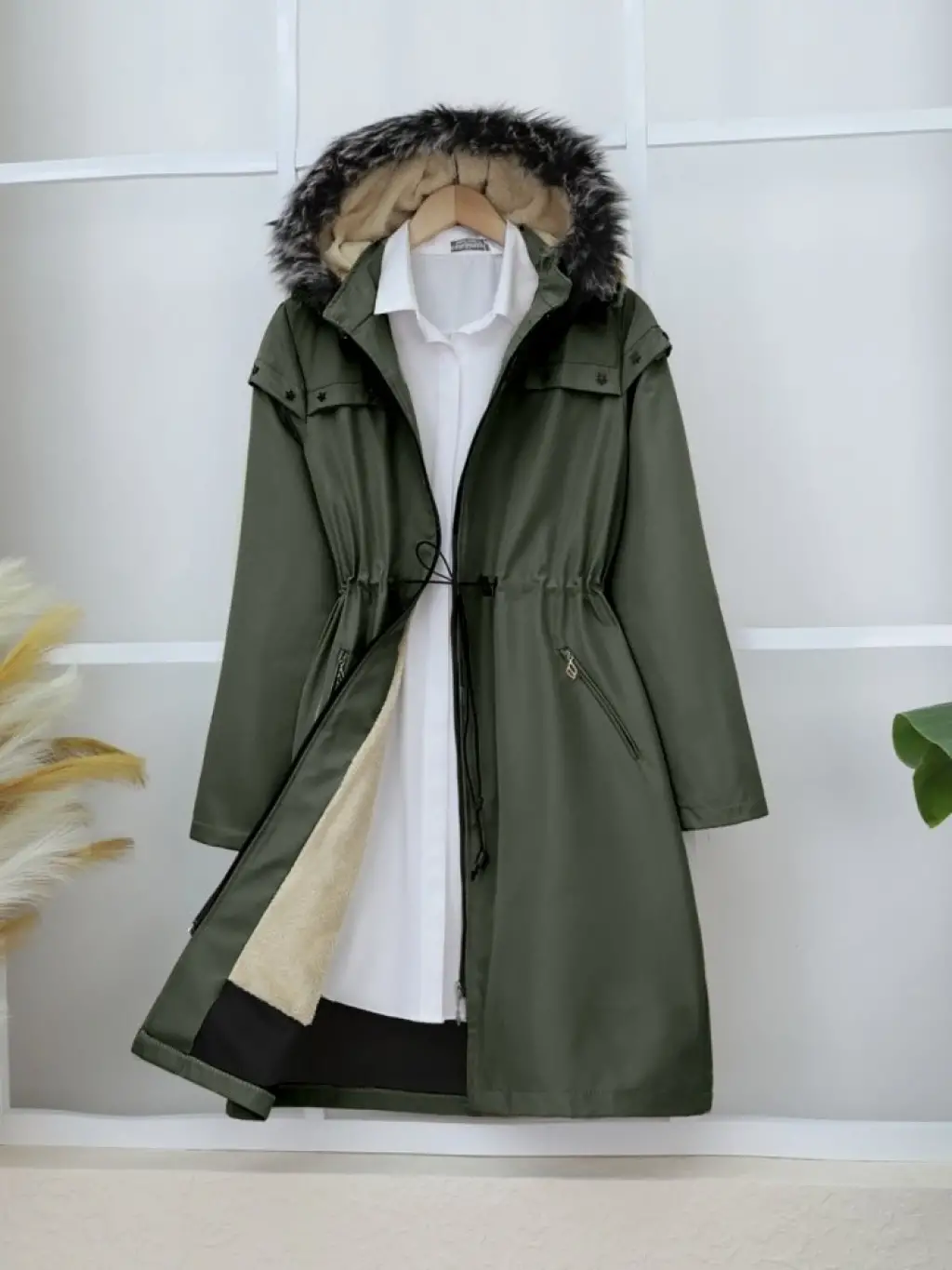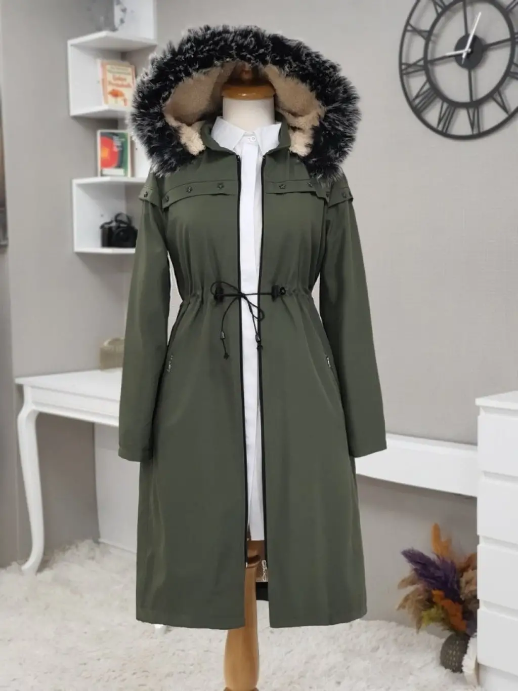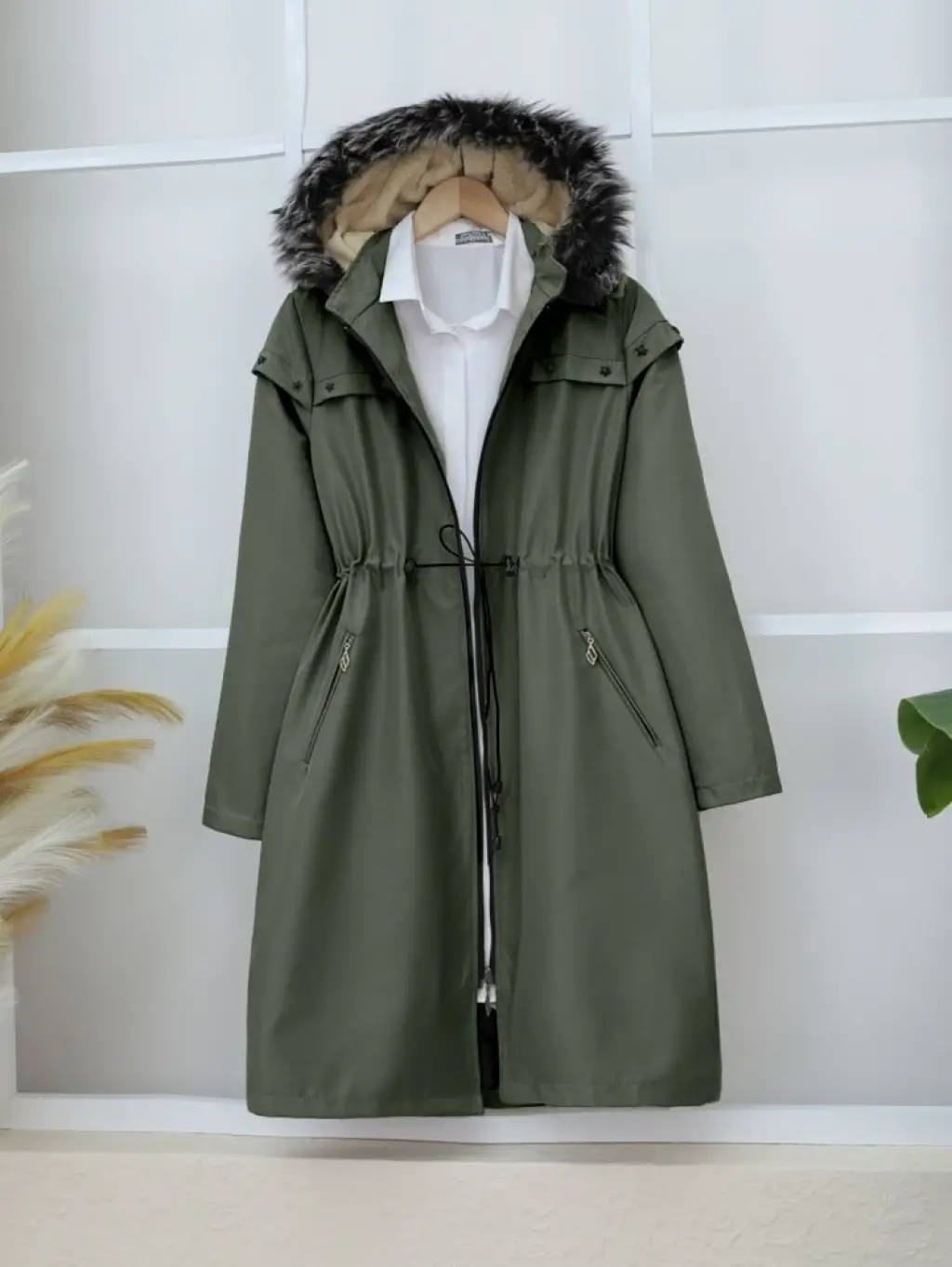 Sabit Kapşonlu Kuş Gözü Detaylı Uzun Kaban -Haki