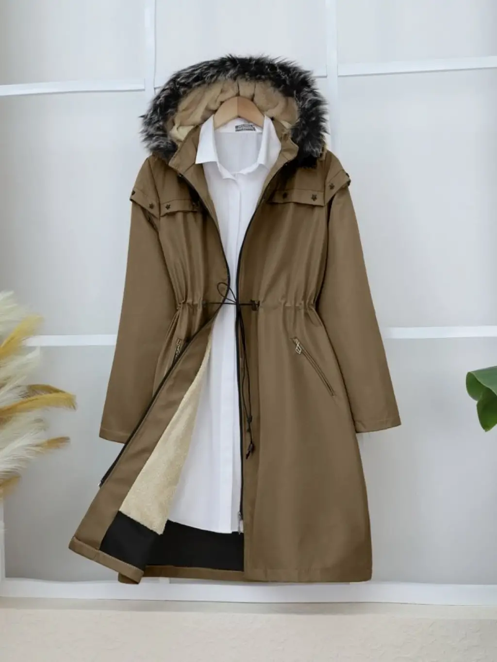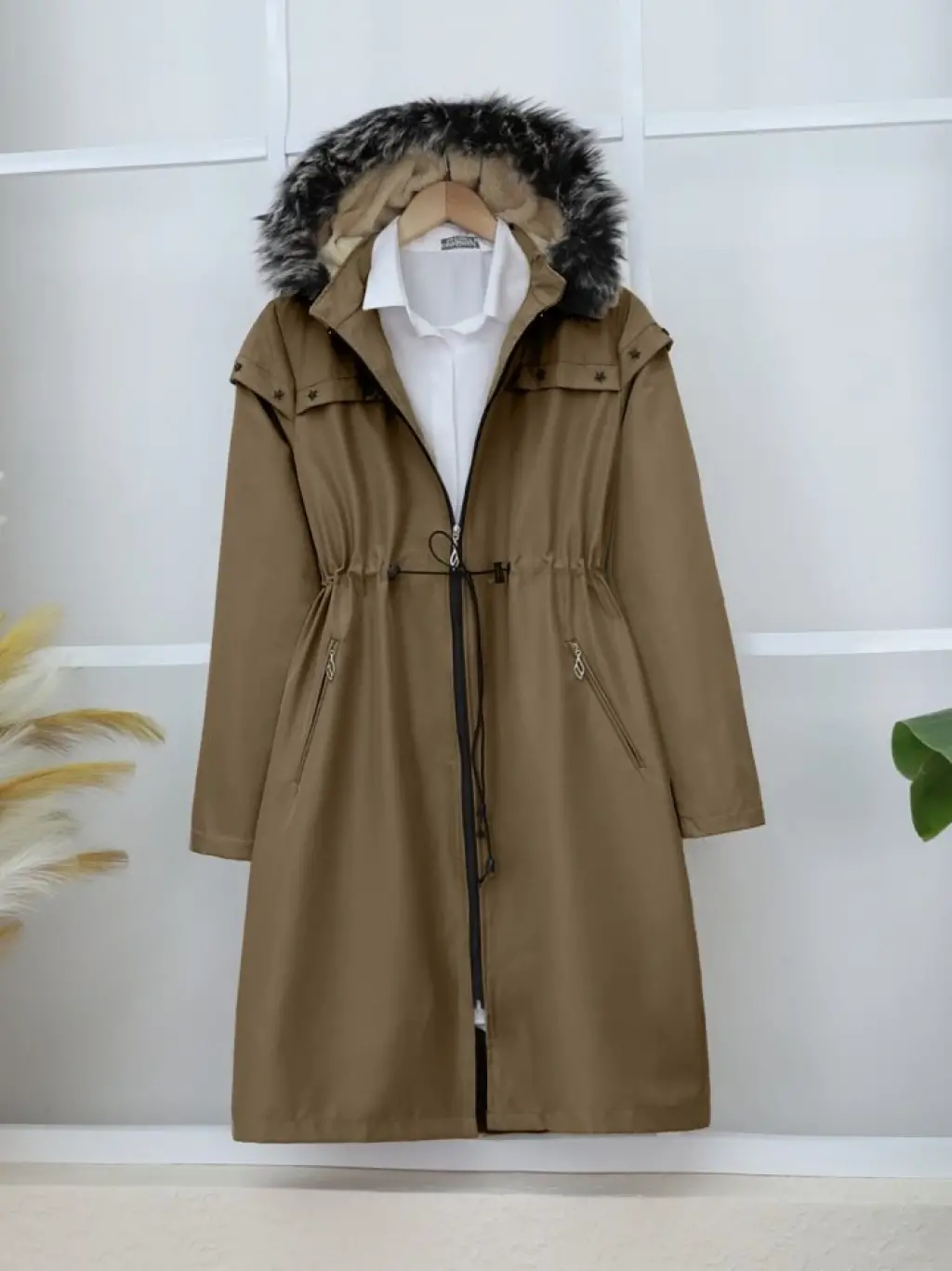 Çıkma Kapşonlu Yıldız Metal Detaylı Kaban -Taba