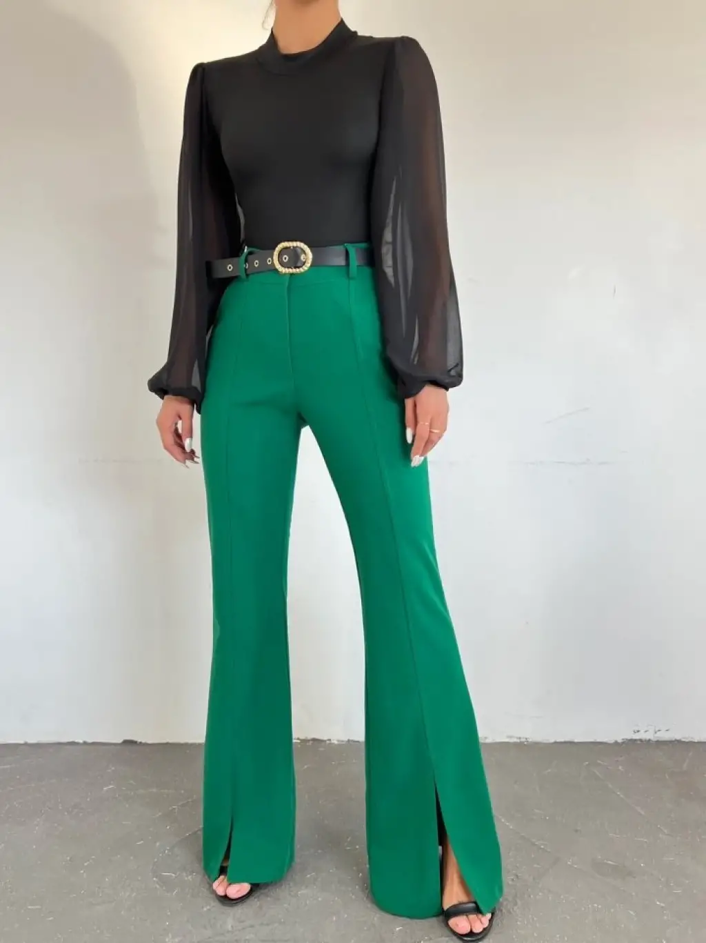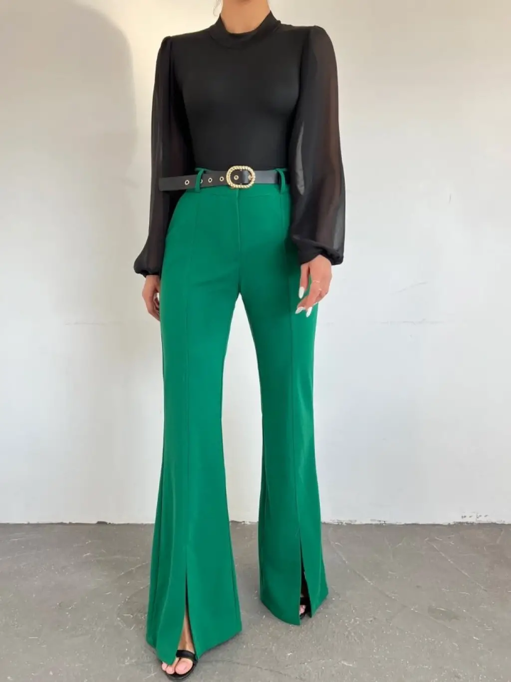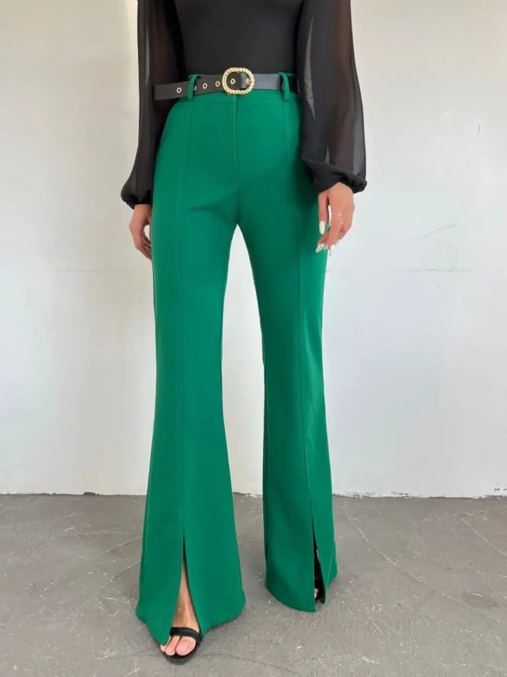 İspanyol Paça Yırtmaçlı Kemerli Pantolon -Yeşil
