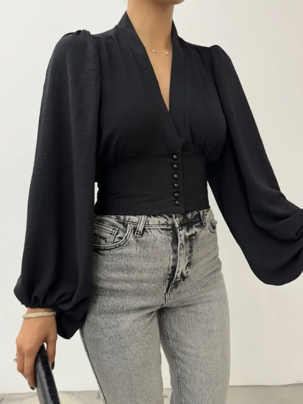 Siyah Düğmeli Arkası Lastikli Balon Kol Crop Kadın Giyim