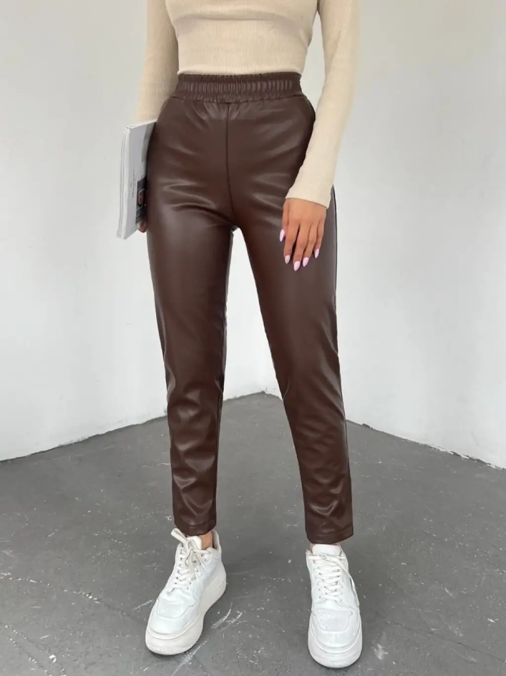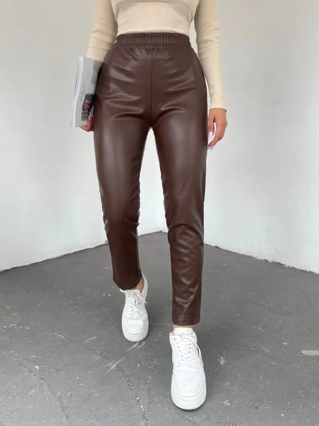 Beli Lastikli Deri Pantolon -Kahve