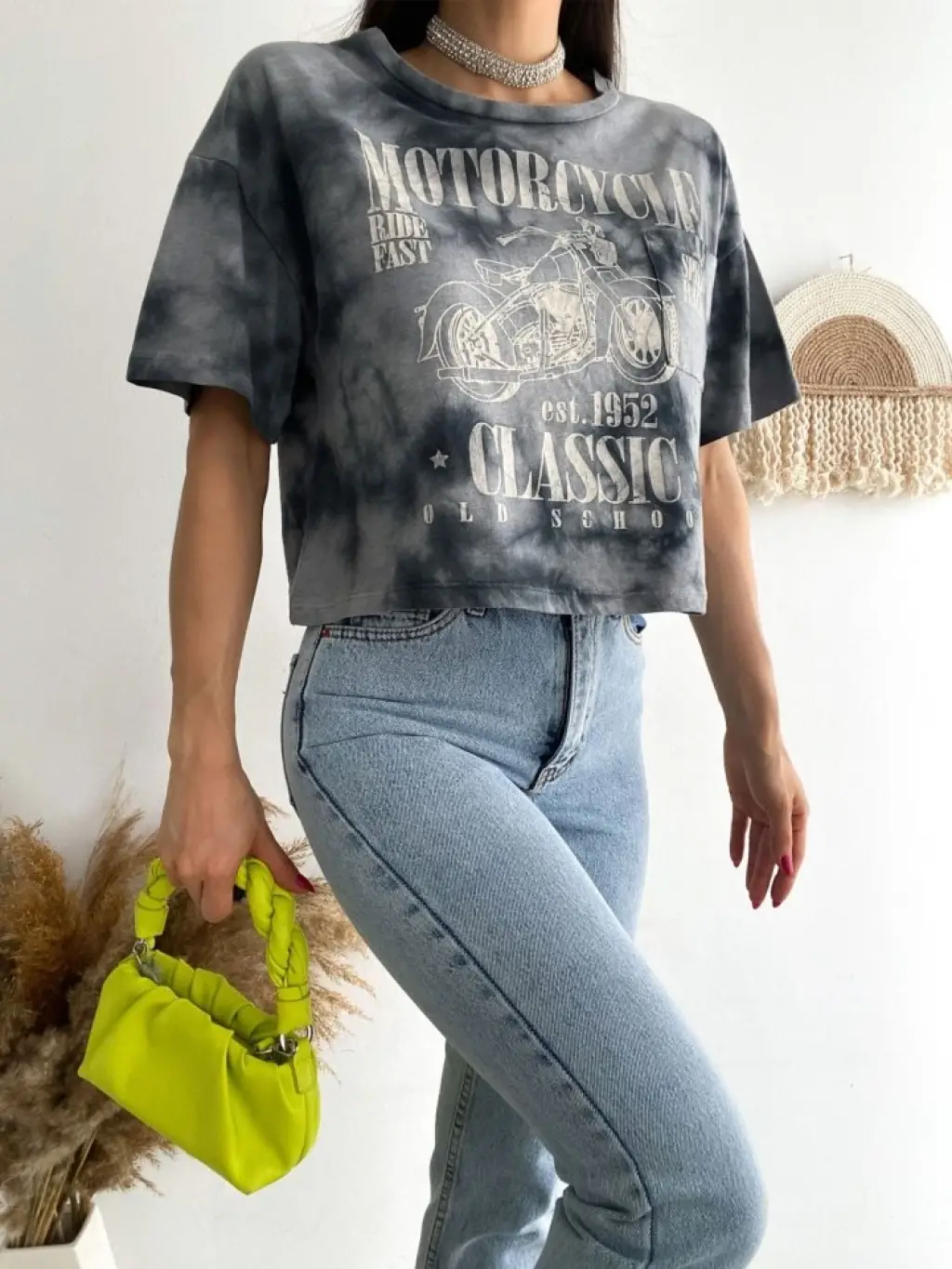 Motosiklet Baskılı Yıkamalı Crop Tişort -Gri