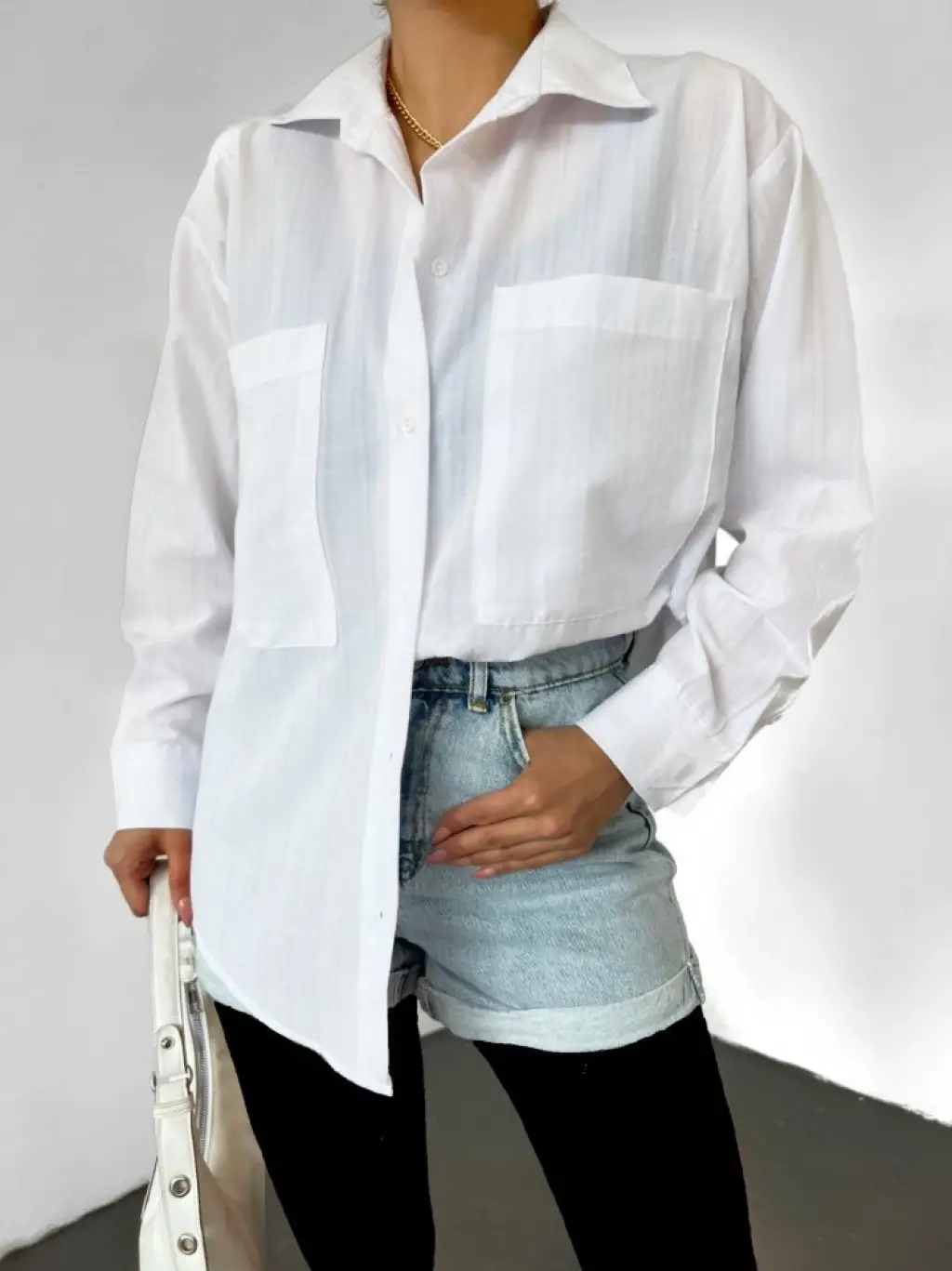Çift Cepli Arkası Uzun Gofre Gömlek -Beyaz