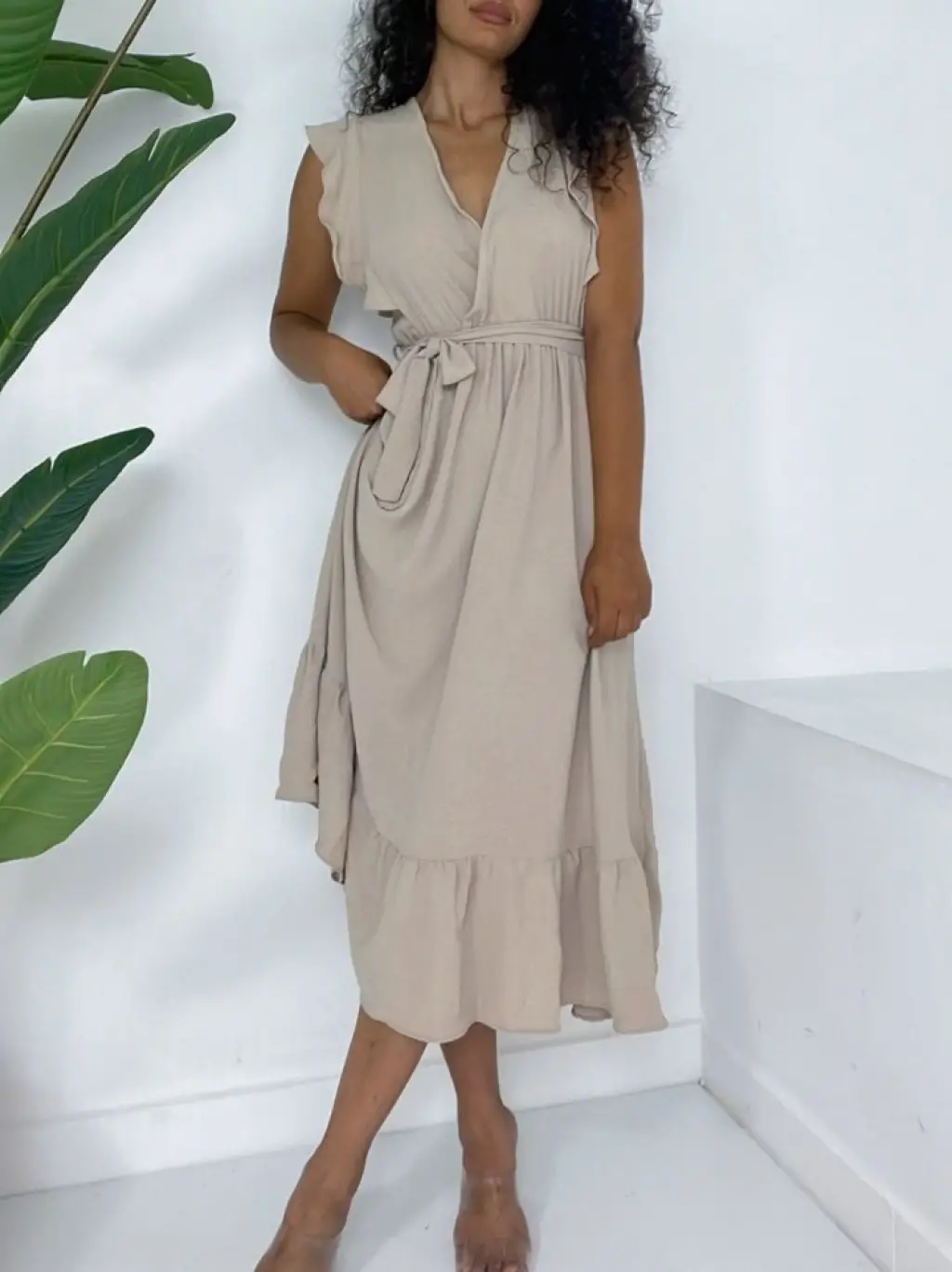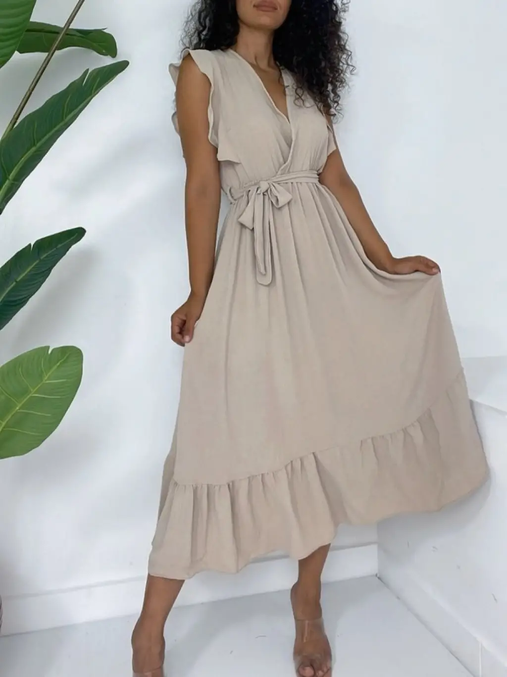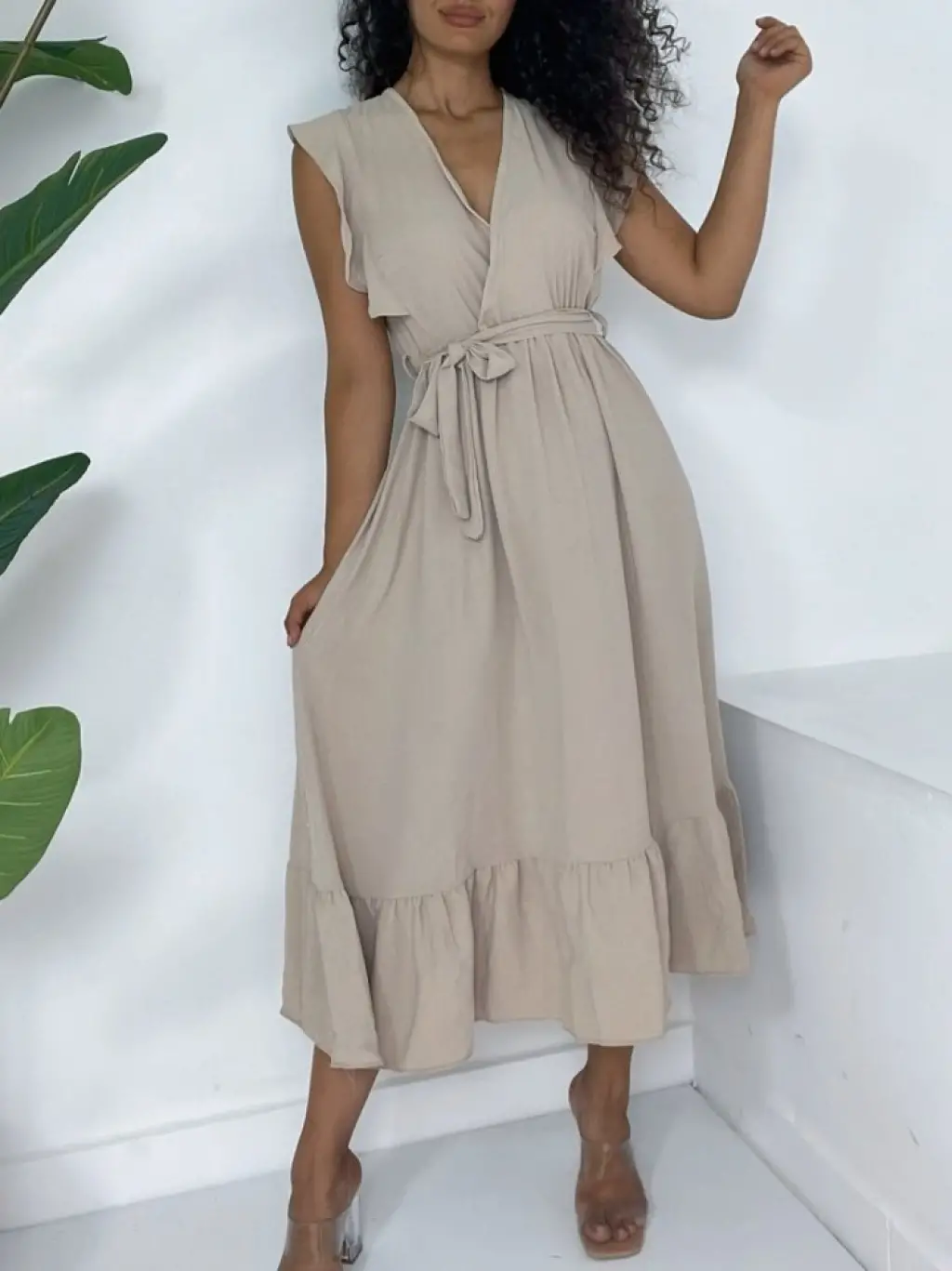 Omuzları Fırfırlı Sıfır Kol Beli Lastikli Bağcıklı Ayrobin Elbise -Vizon