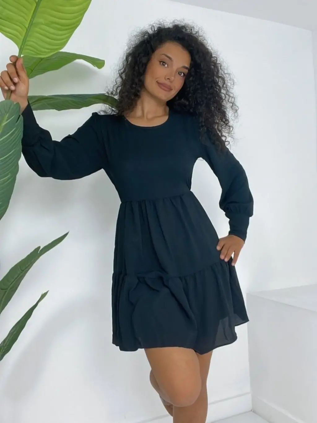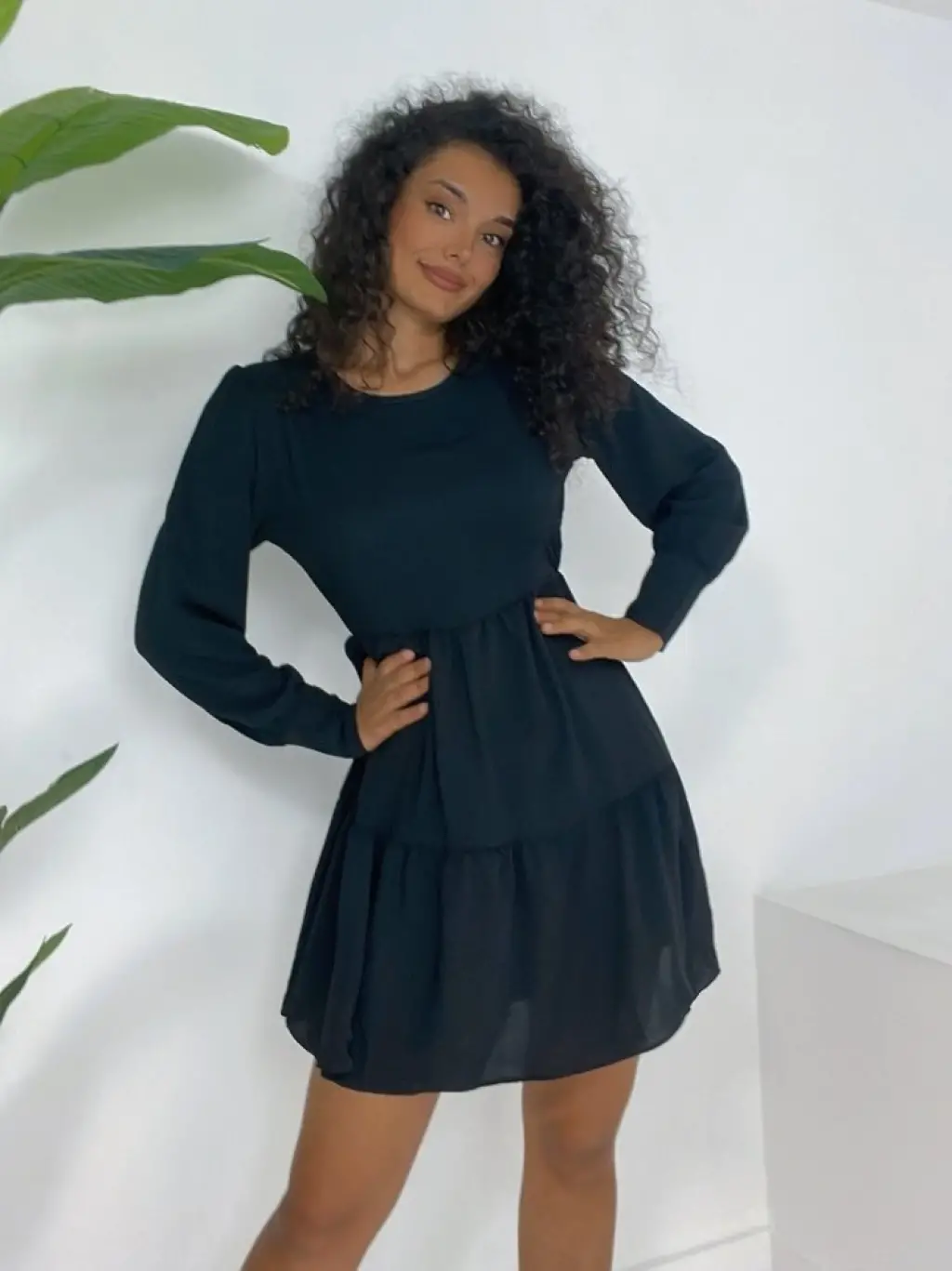 Yuvarlak Yaka Beli Lastikli Eteği Katlı Ayrobin Elbise -Siyah