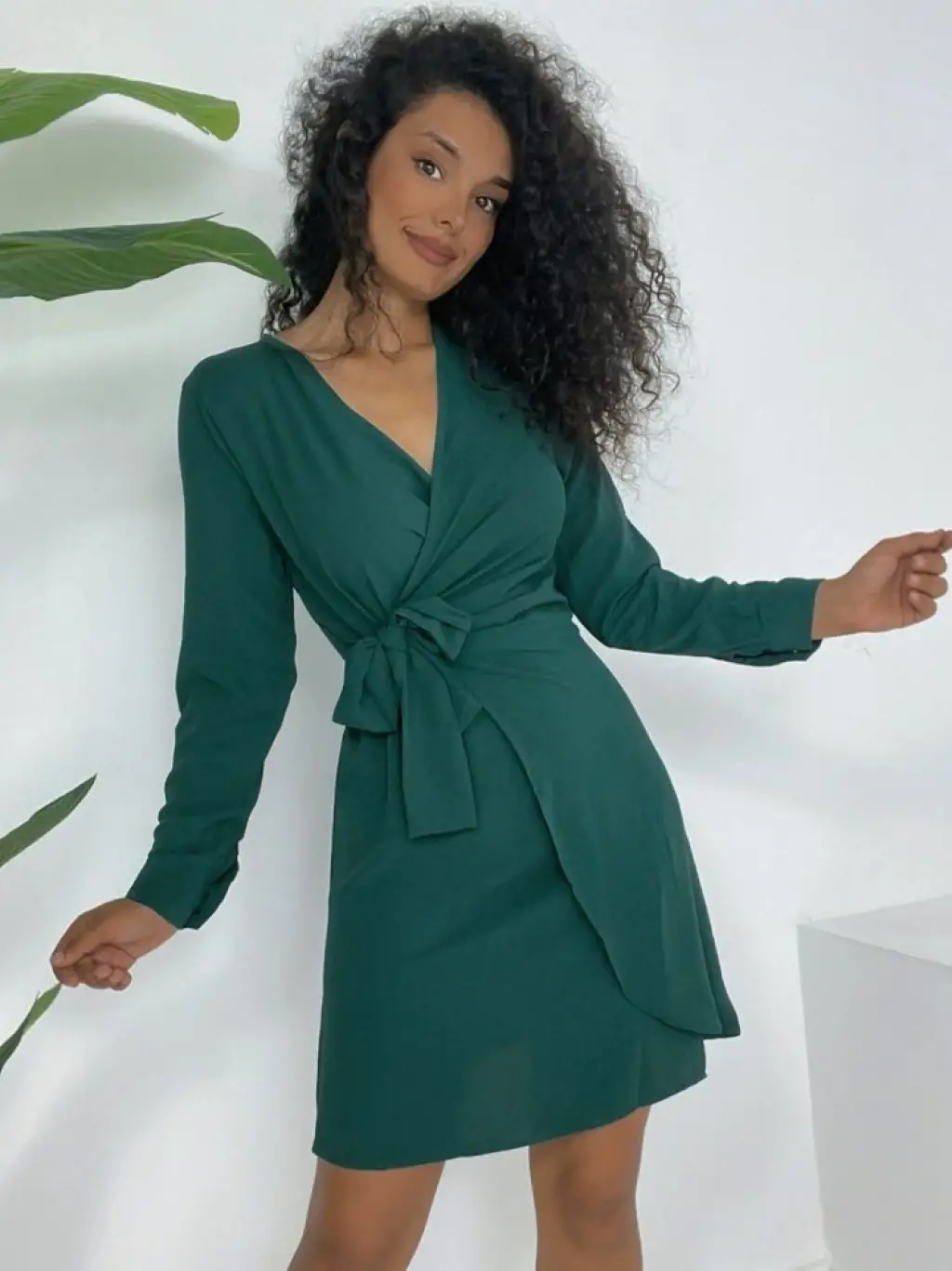 Kruvaze Yaka Bağlamalı Fırfırlı Ayrobin Elbise -Zümrüt