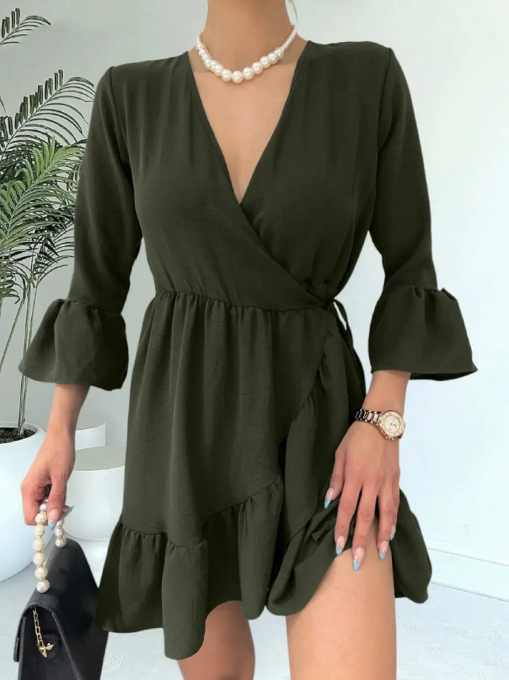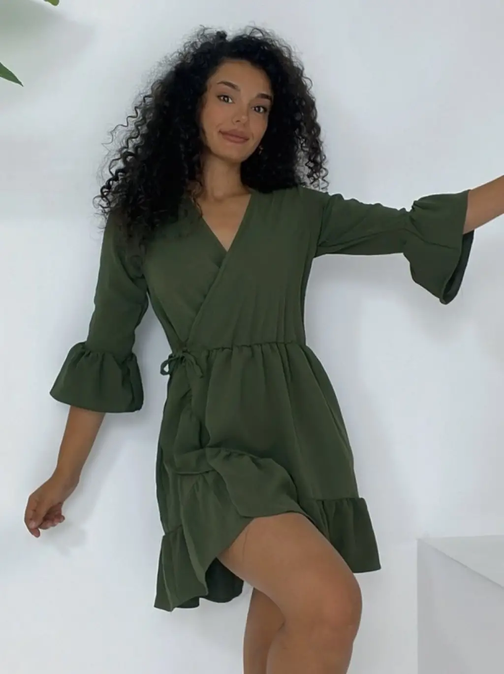 Kadın Askılı Kruvaze Yakalı Fırfırlı Janjan Krep Elbise