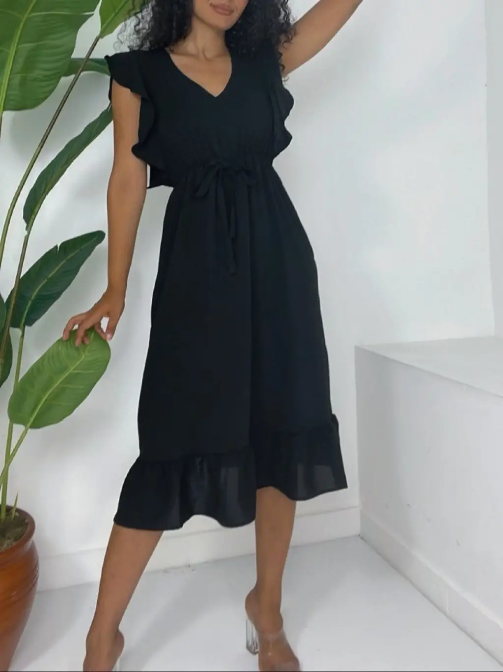Omuzu Fırfırlı Beli Lastikli Sıfır Kol Midi Boy Ayrobin Elbise -Siyah