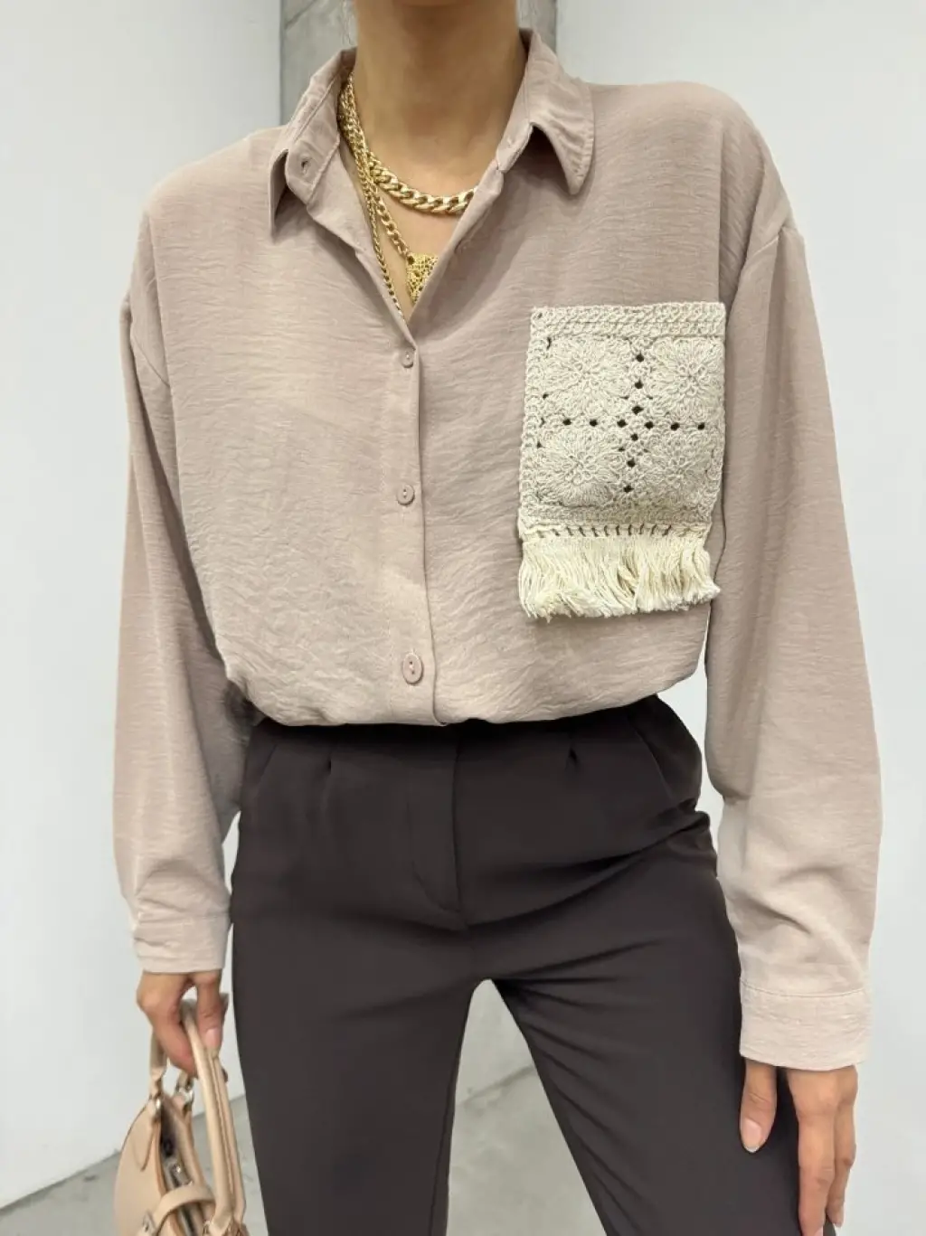 Örgü Cepli Düğmeli Ayrobin Gömlek -Açık Vizon