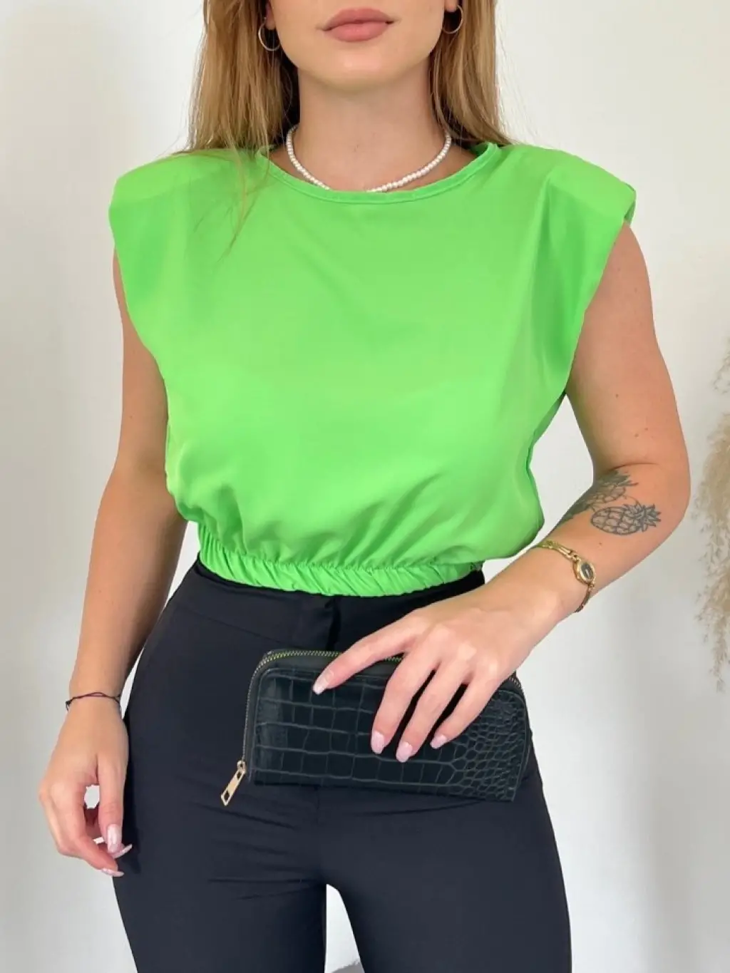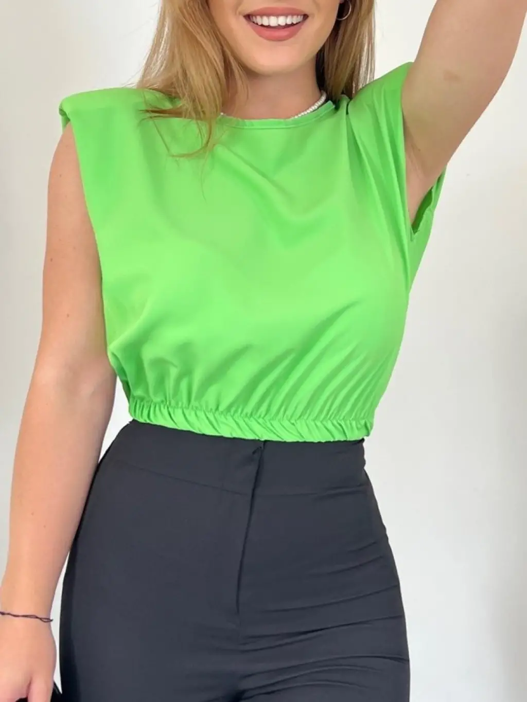 Omuzları Vatkalı Beli Lastikli Bluz -A.Yeşil