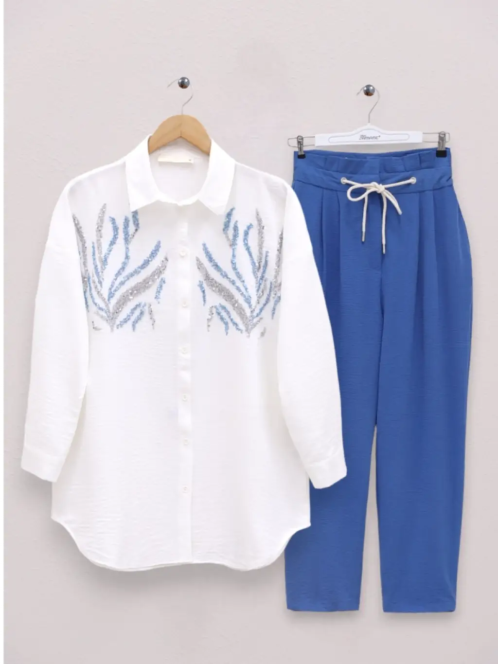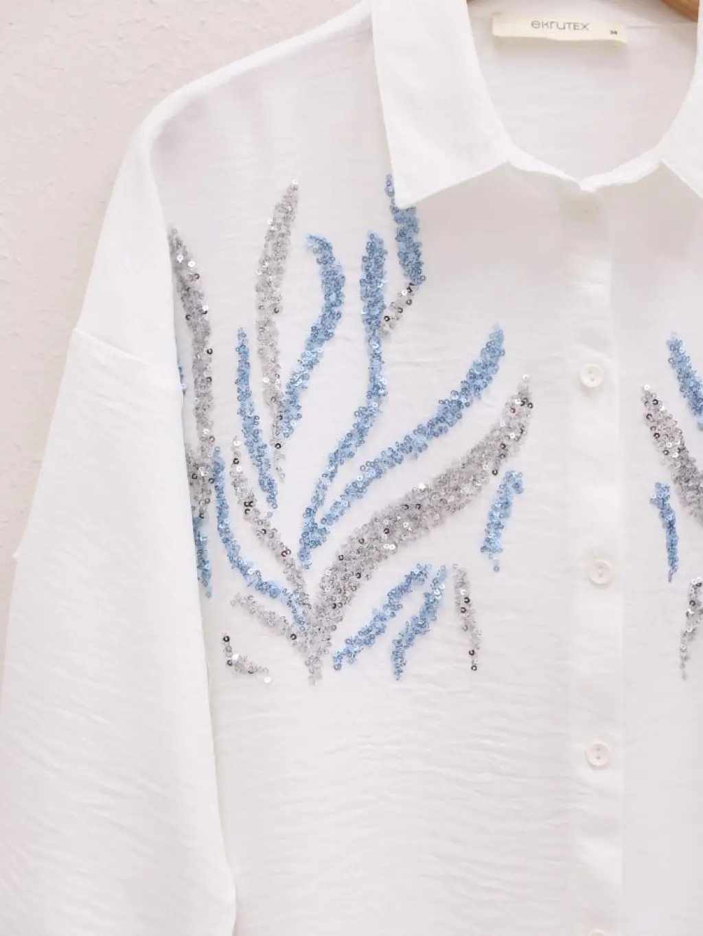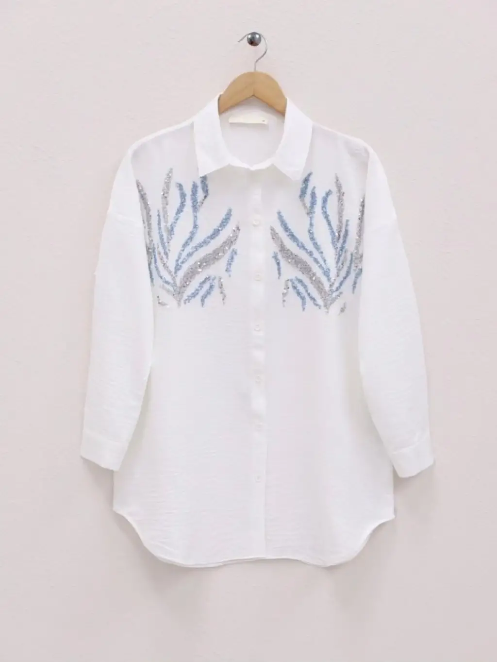 Önü Pul Payetli Uzun Gömlek -Beyaz