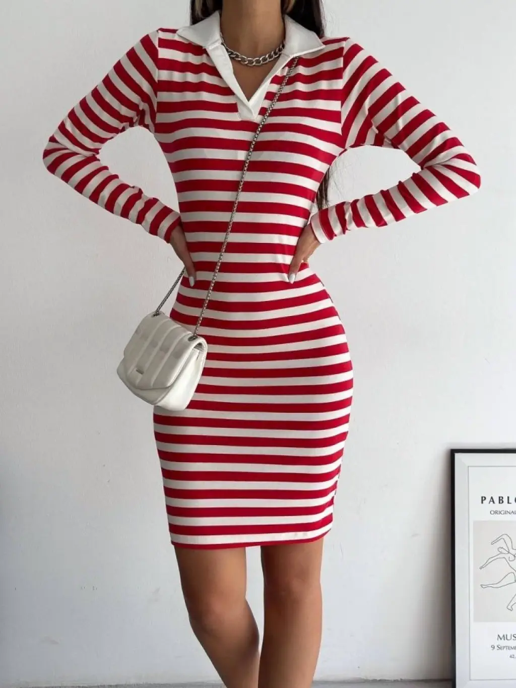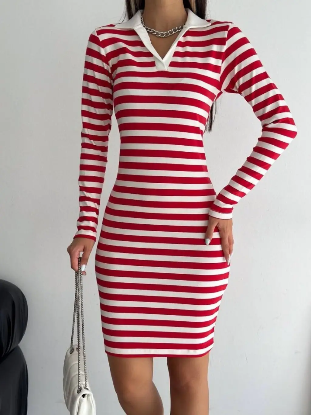 Yakalı Çizgili Uzun Kol Elbise -Kırmızı