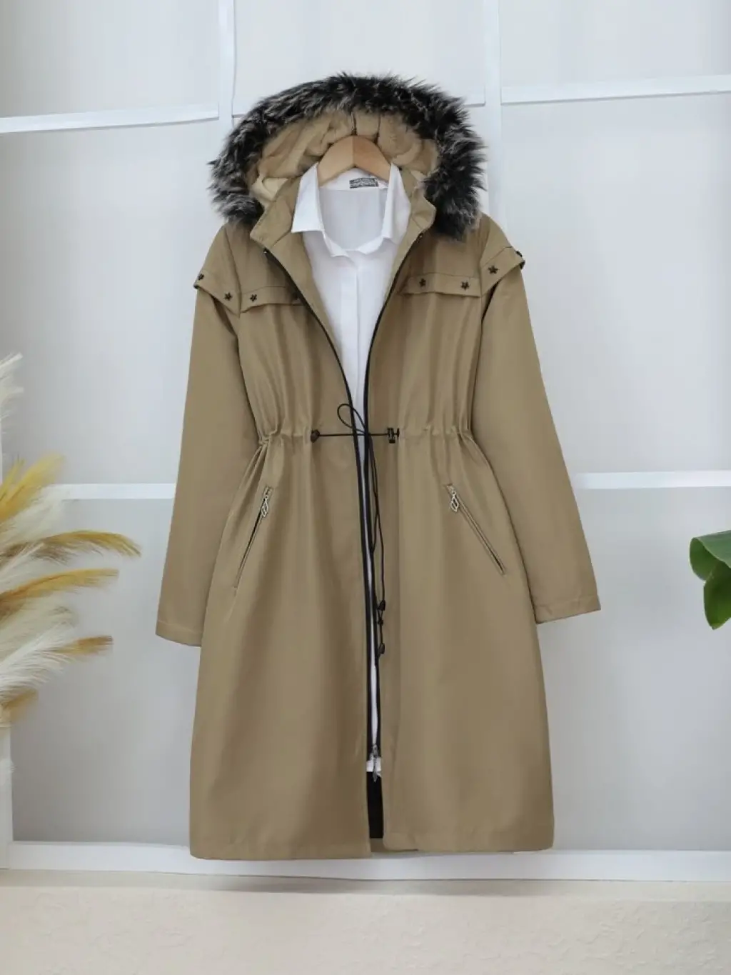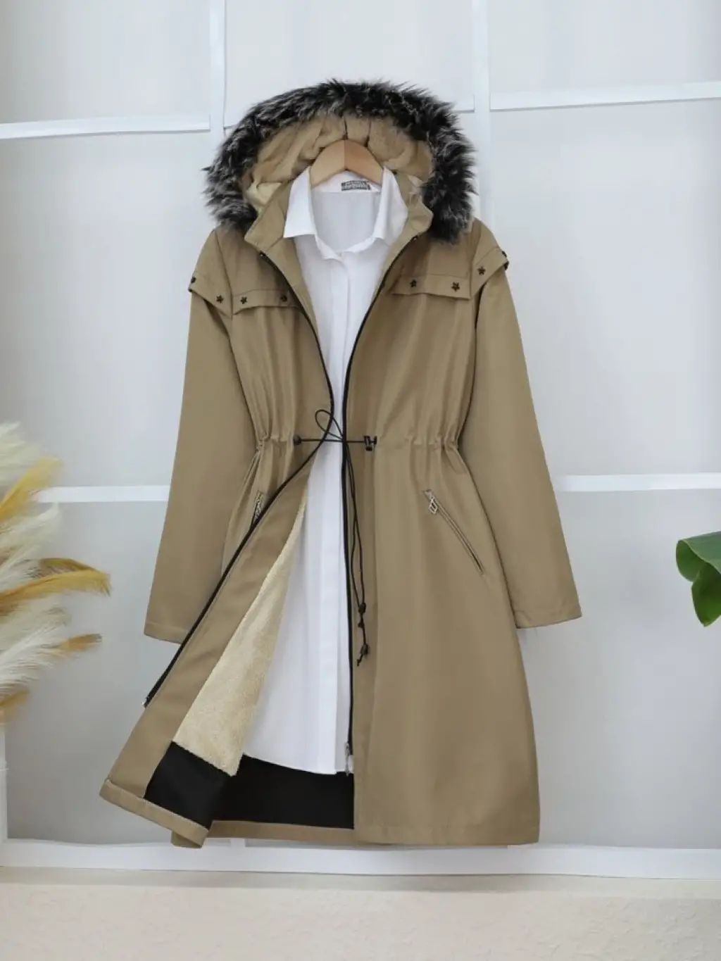Çıkma Kapşonlu Yıldız Metal Detaylı Kaban -Taba