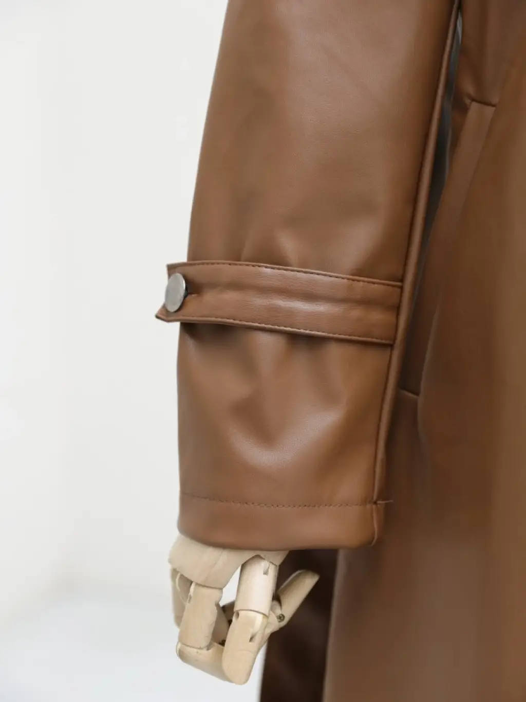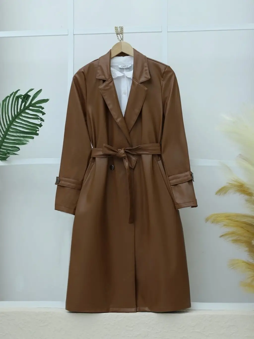 Kemerli Yan Cepli Deri Trenckot -Kahve