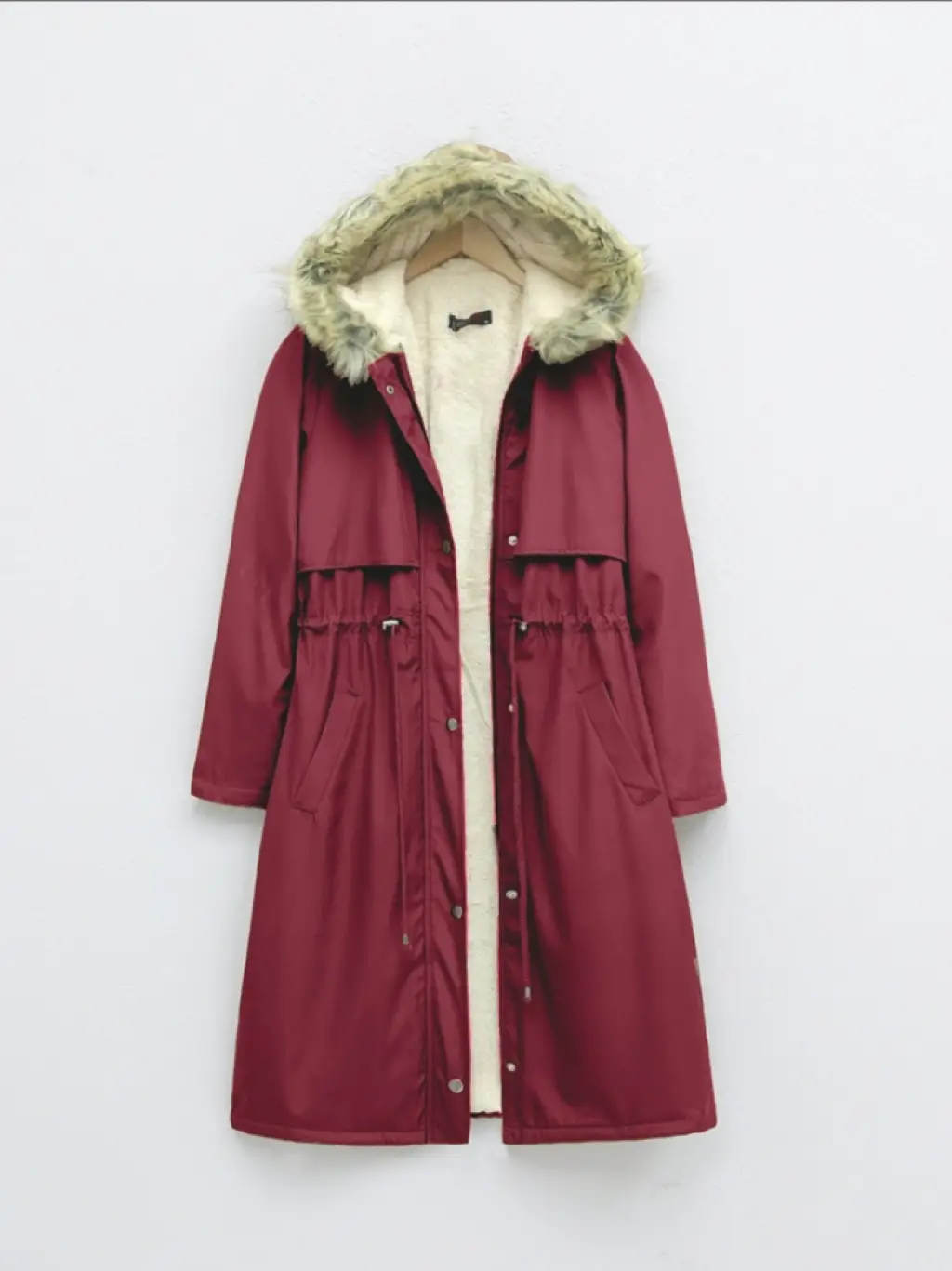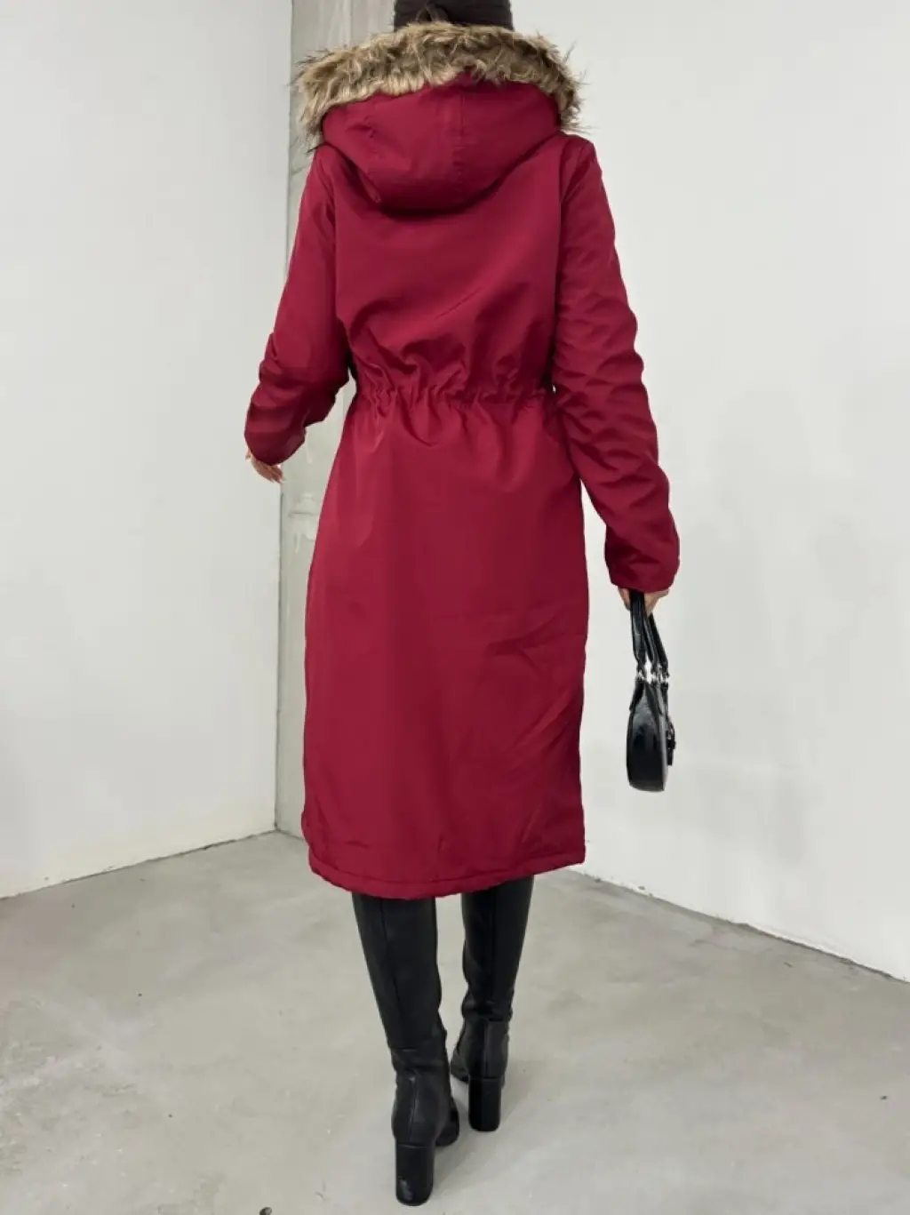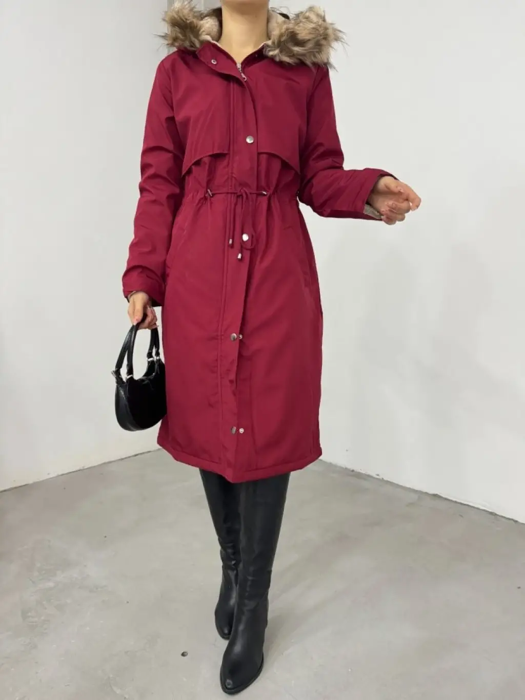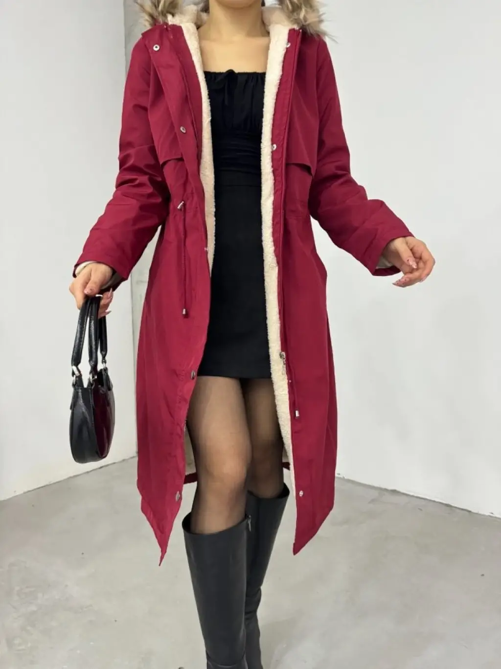 Bordo İçi Peluşlu Sabit Kapşonlu Uzun Mont Kadın Giyim
