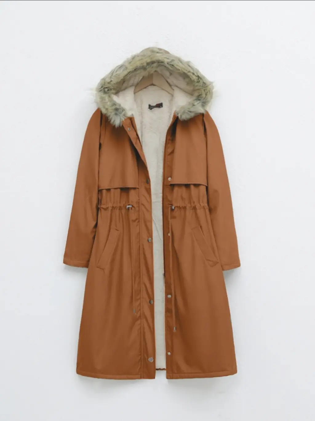 Kürklü Çıkma Kapşonlu Bağcıklı Kaban Taba Kadın Giyim