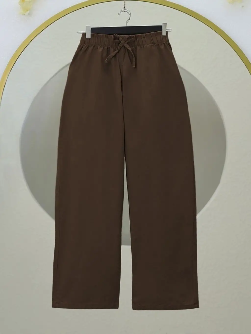 Bağcık Detaylı Bol Paça Beli Lastikli Keten Pantolon -Kahve