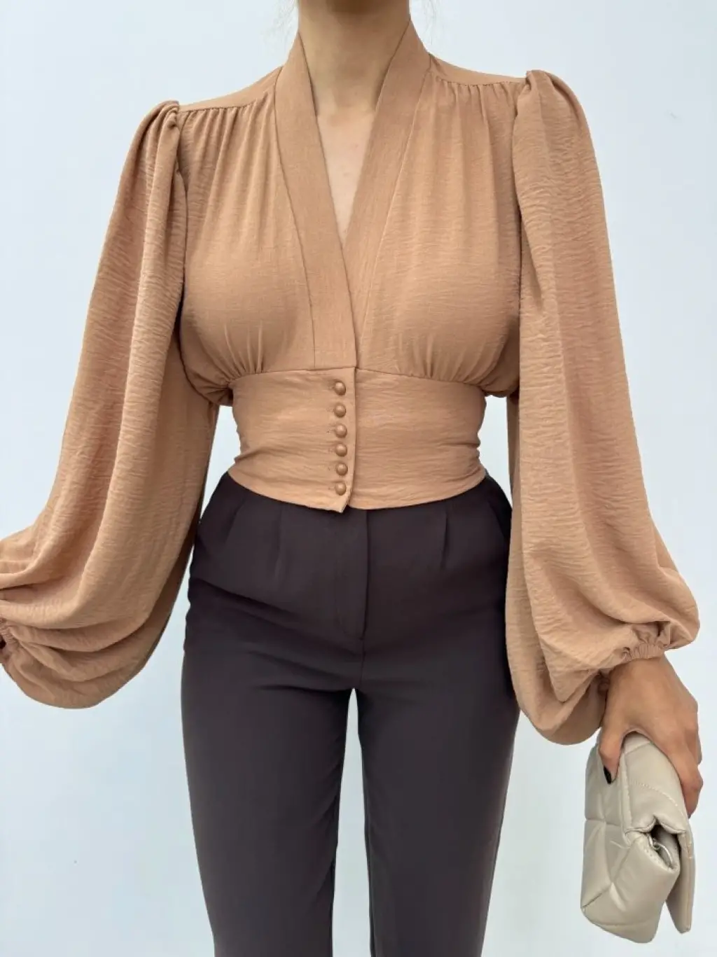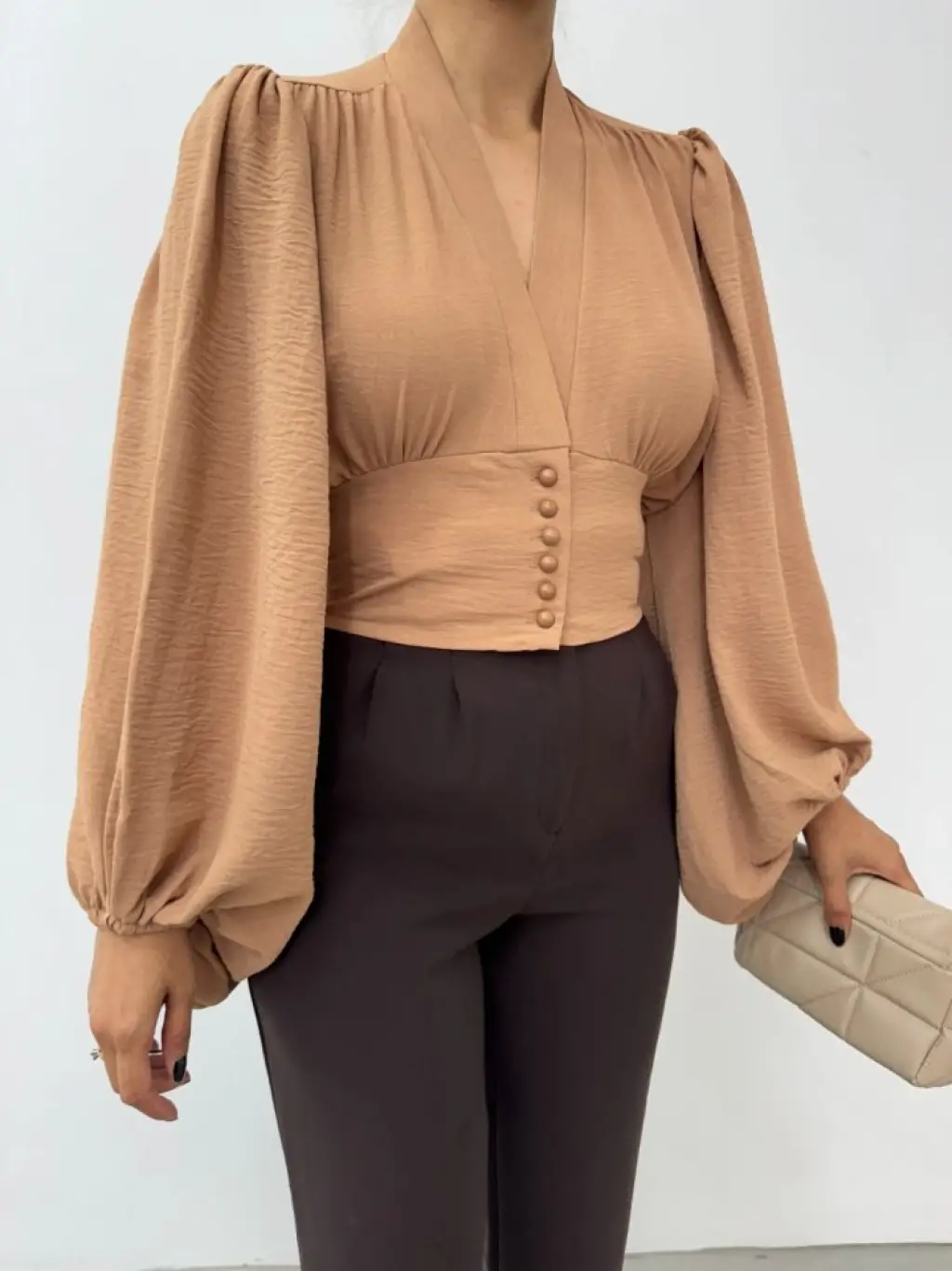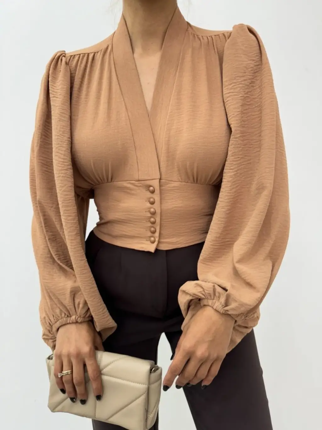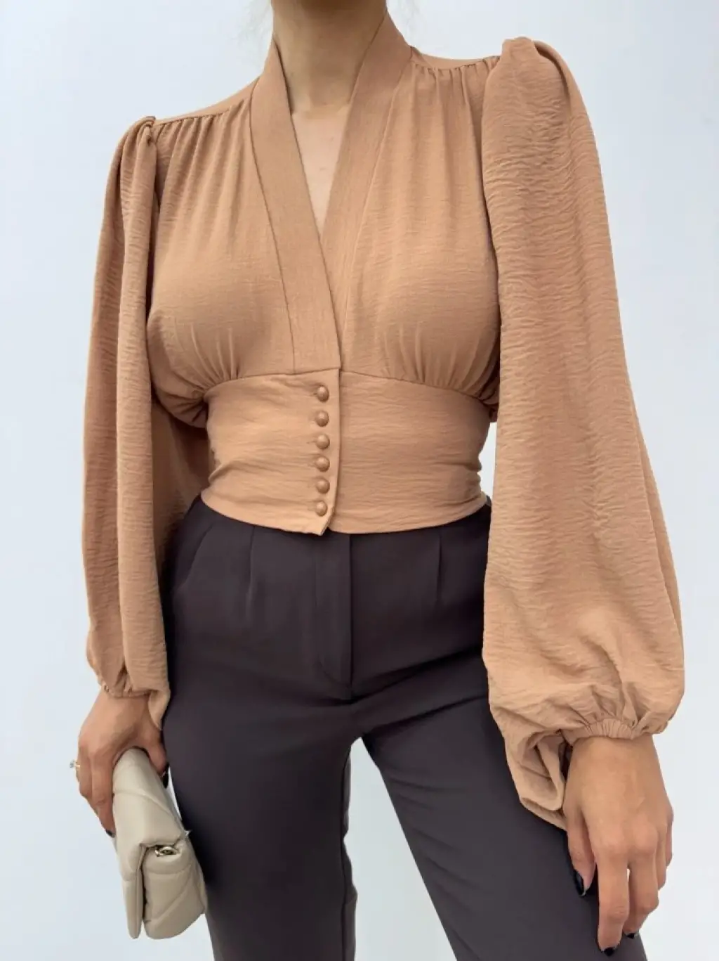 Düğmeli Arkası Lastikli Balon Kol Sandy Crop -Vizon