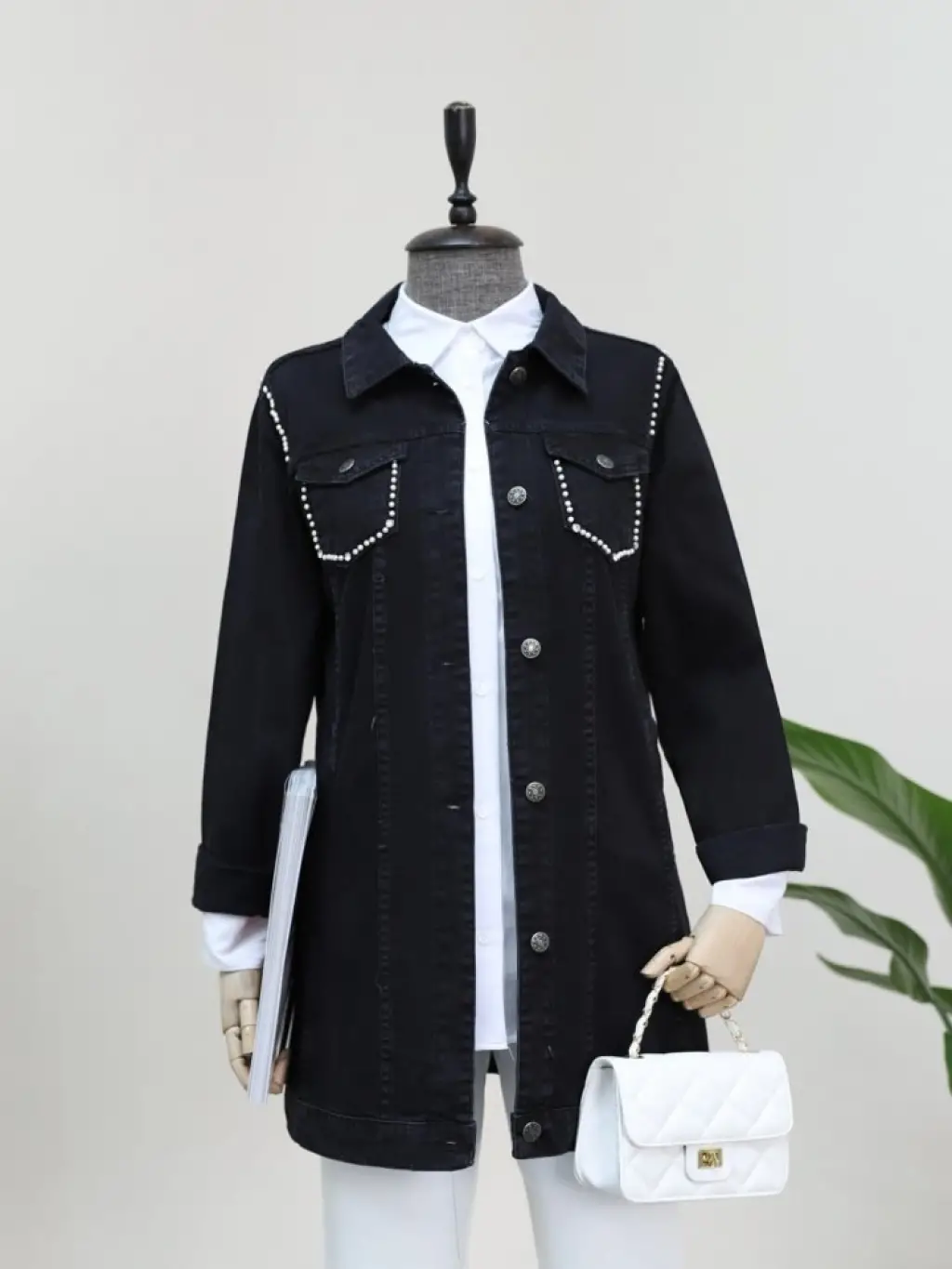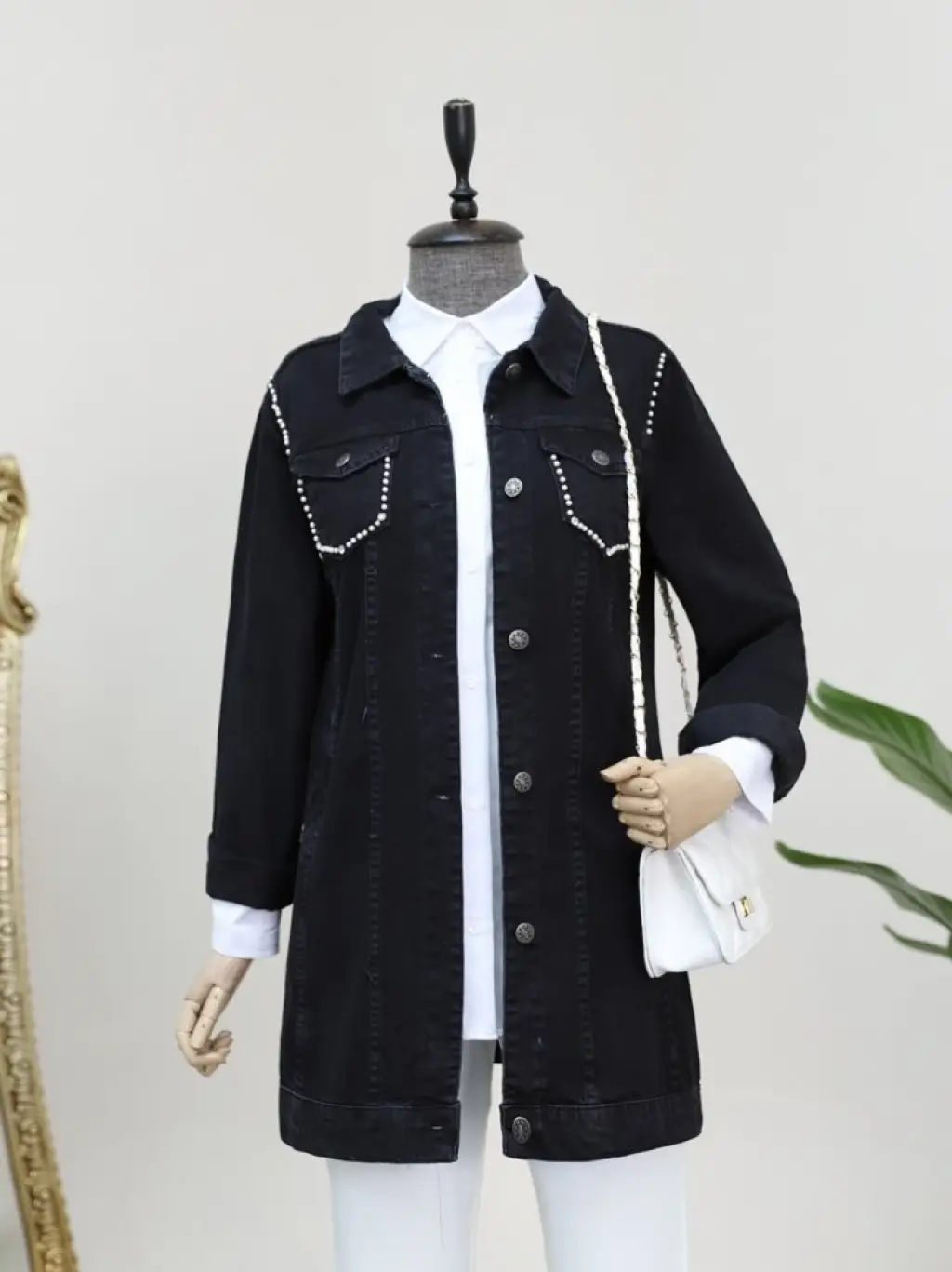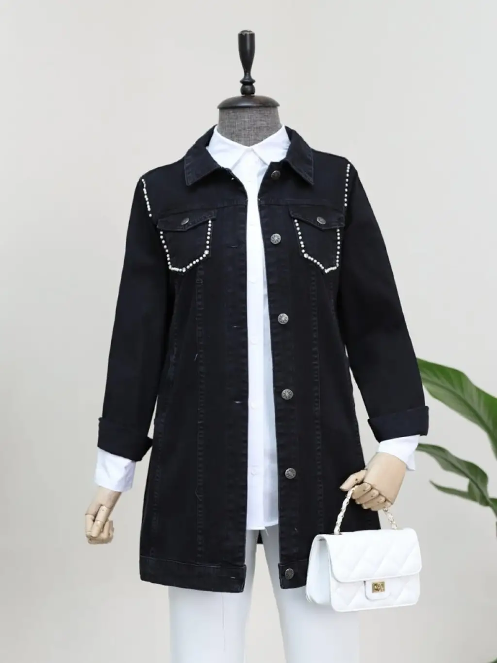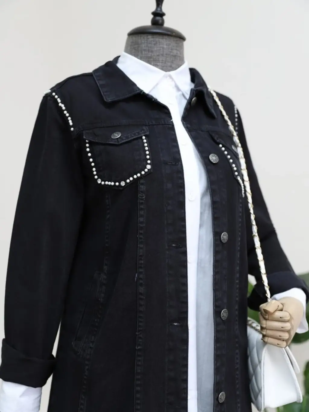 Cebi Ve Omuzları İncili Random Yıkama Kot Ceket -Siyah