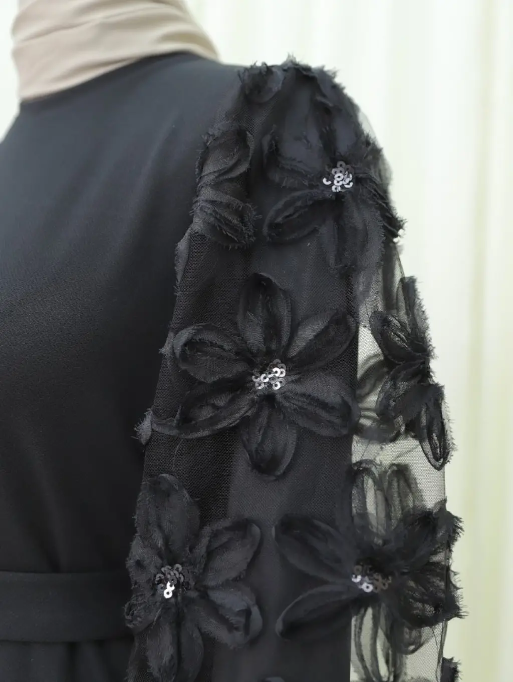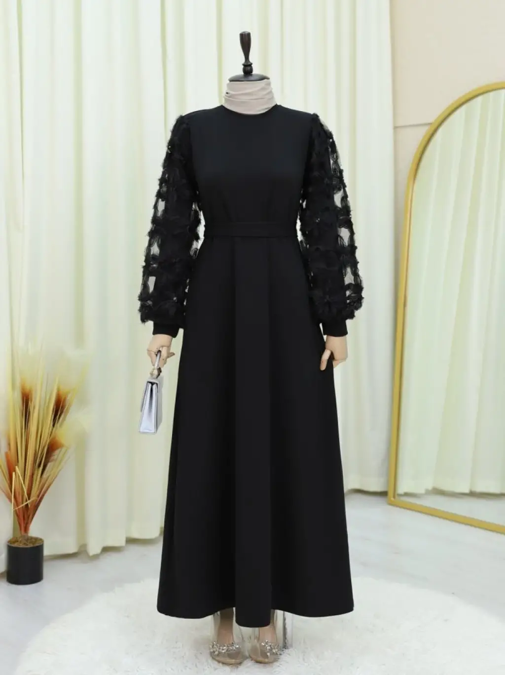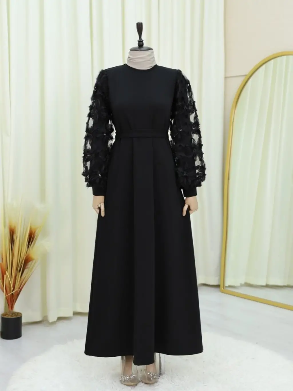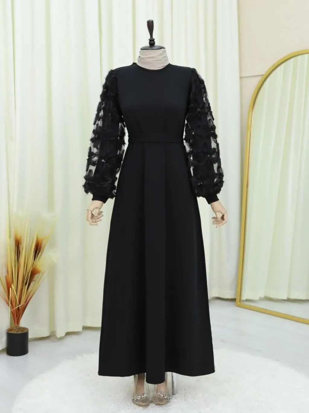 Kabartma Çiçekli Tül Kollu Kemerli Elbise -Siyah