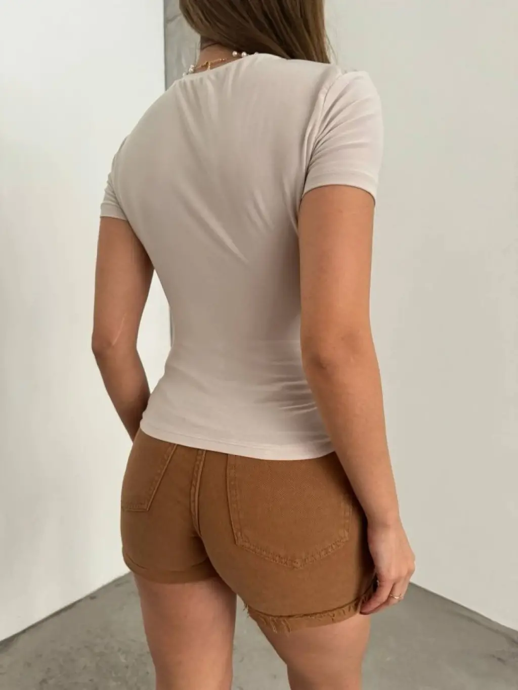 Çapraz Büzgülü Kısa Kol Sandy Bluz -Bej