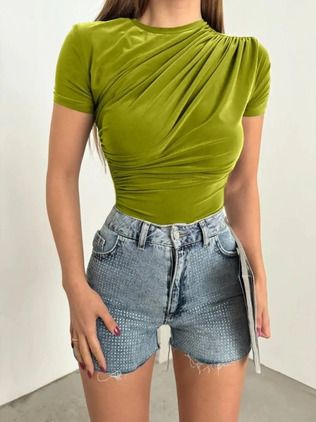 Çapraz Büzgülü Kısa Kol Sandy Bluz -Yağ Yeşili