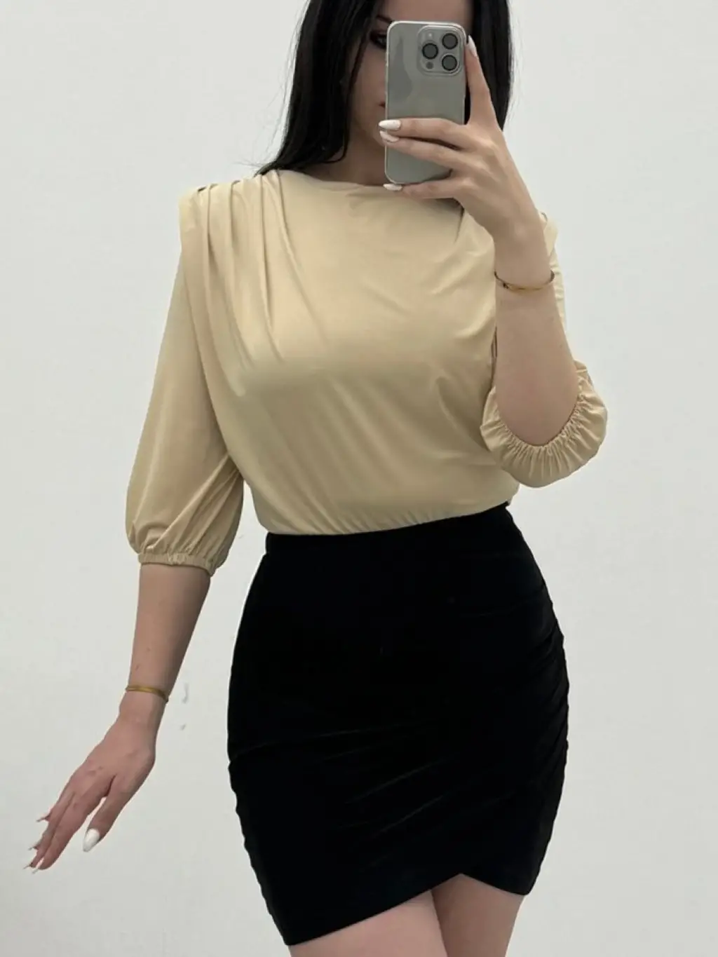 Saten Kolsuz Belki Lastikli Bluz - Ekru