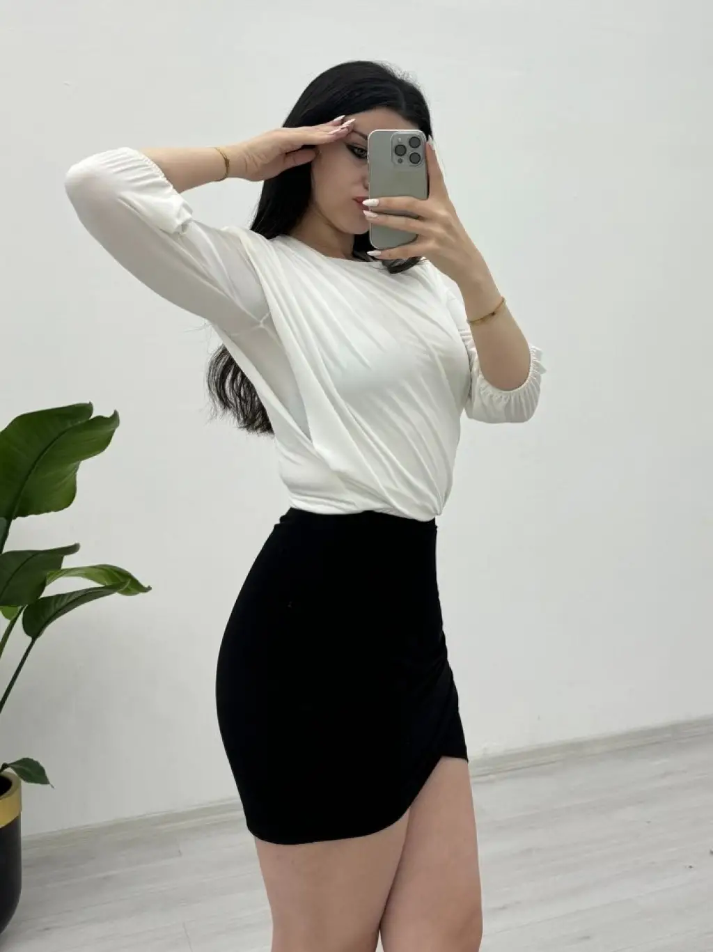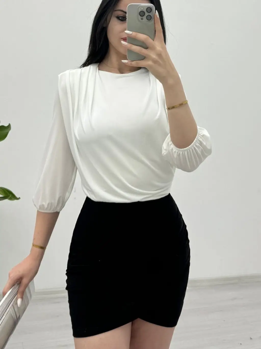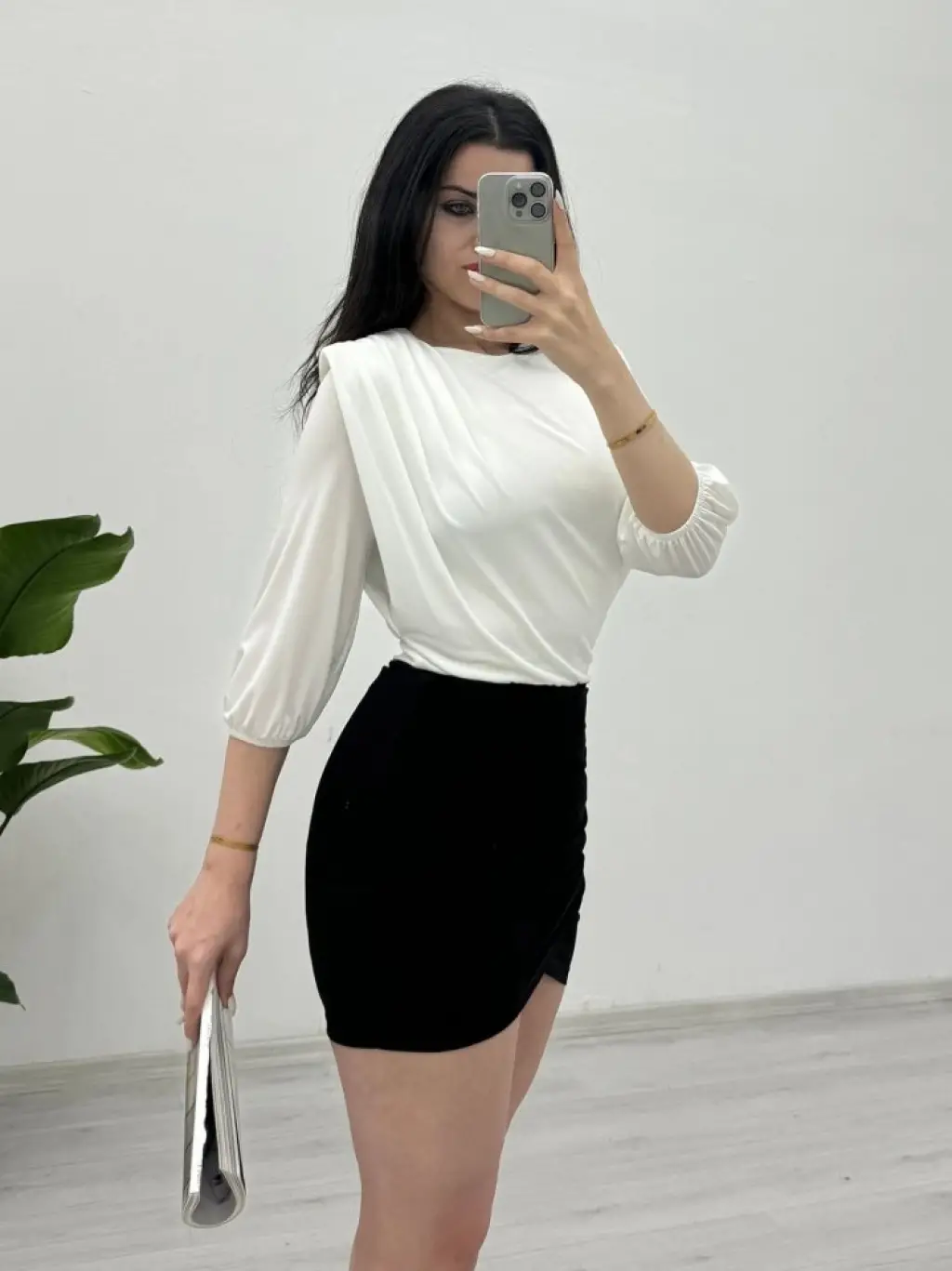 İçi Tulumlu Omuzdan Büzgülü Vatkalı Sendy Bluz -Beyaz