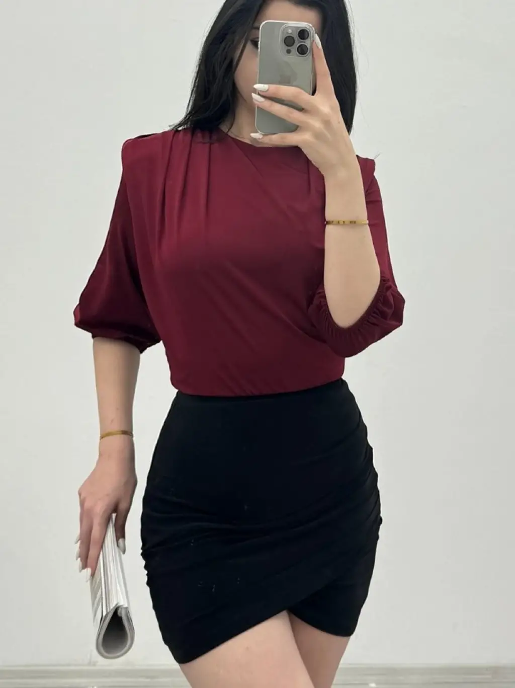 İçi Tulumlu Omuzdan Büzgülü Vatkalı Sendy Bluz -Bordo