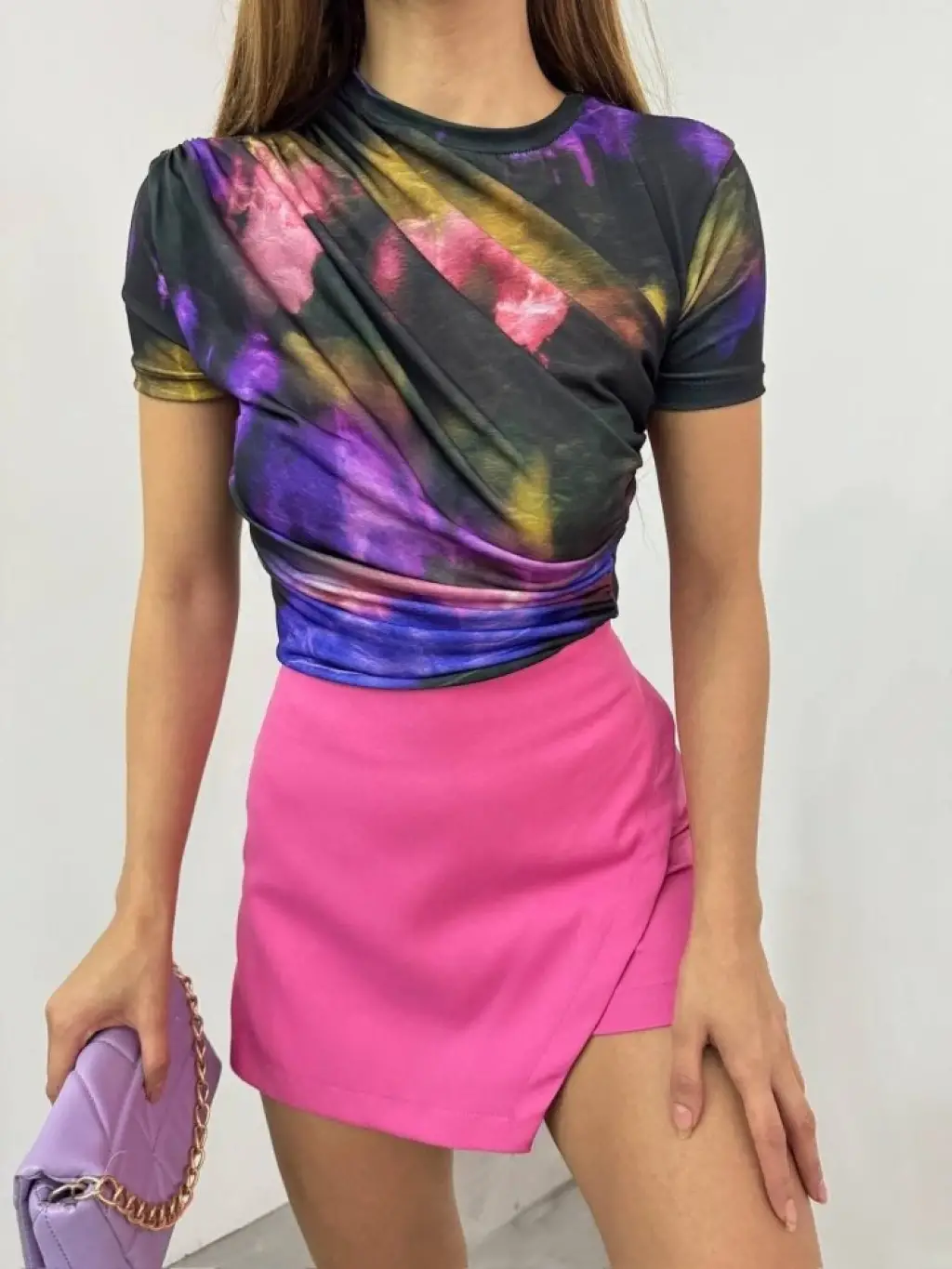 Bel Omuz Büzgülü Batik Baskı Sendy Bluz -Mor