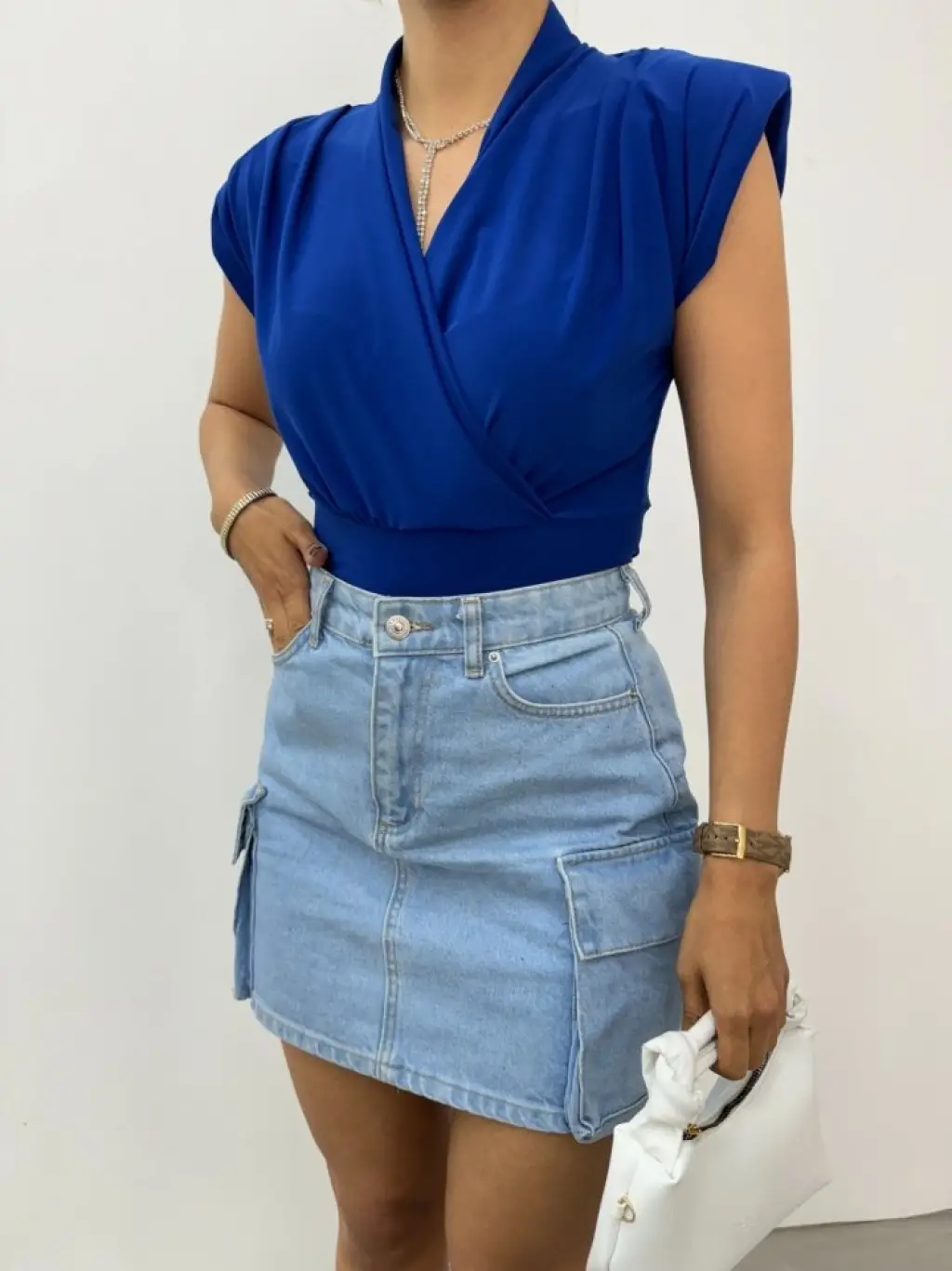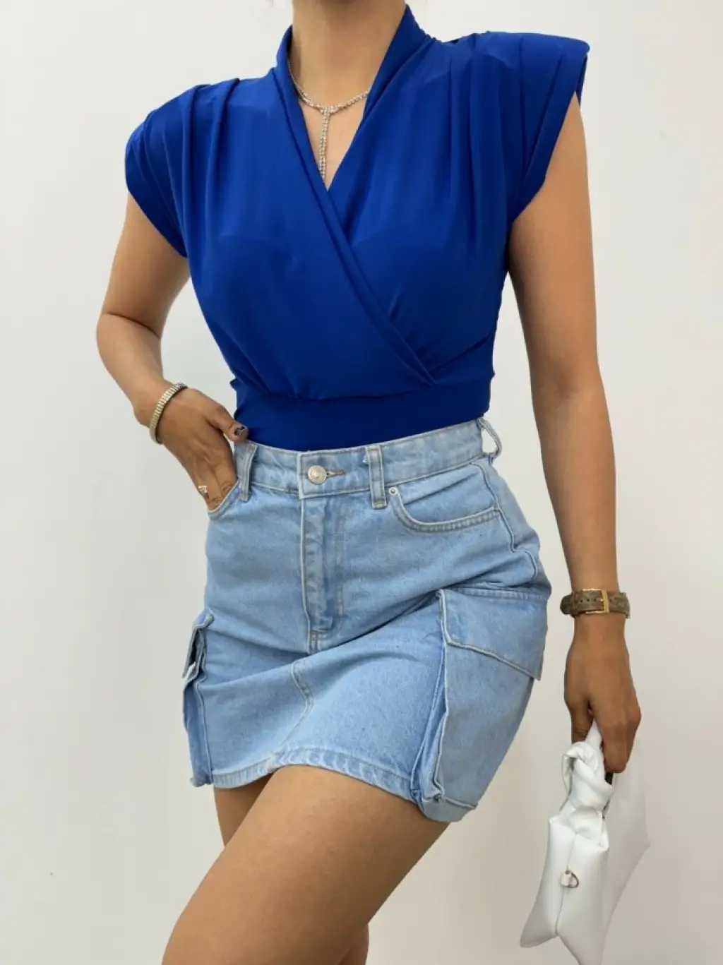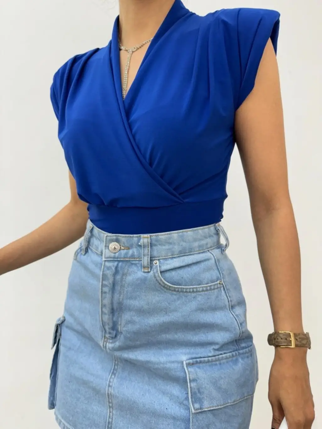 Sıfır Kol Vatkalı Kruvaze Model Sandy Bluz -Saks