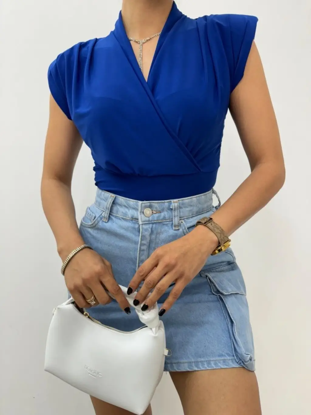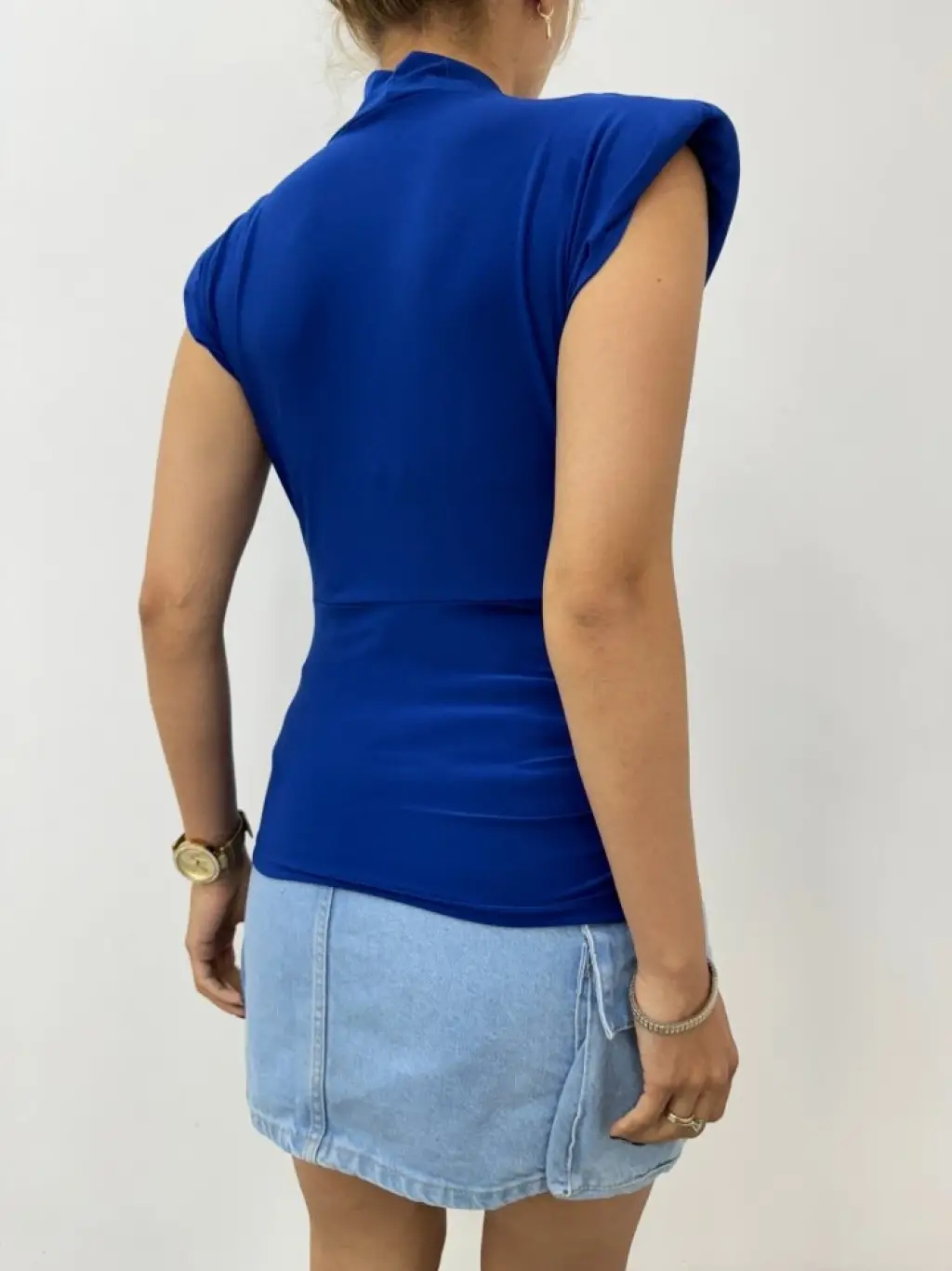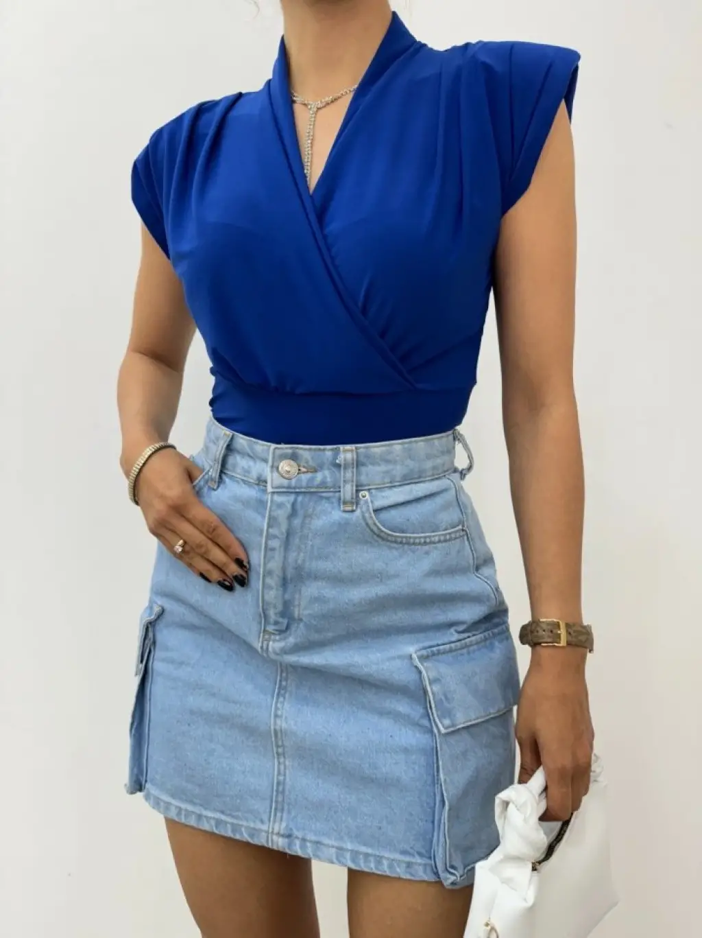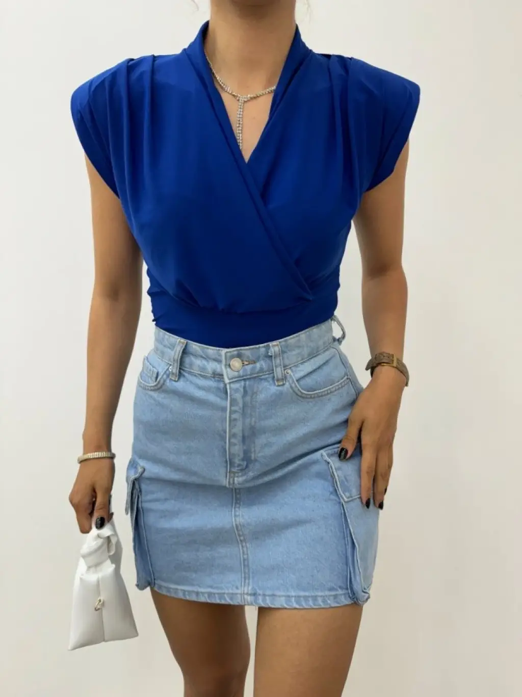 Sıfır Kol Vatkalı Kruvaze Model Sandy Bluz -Saks