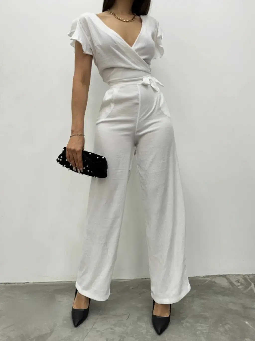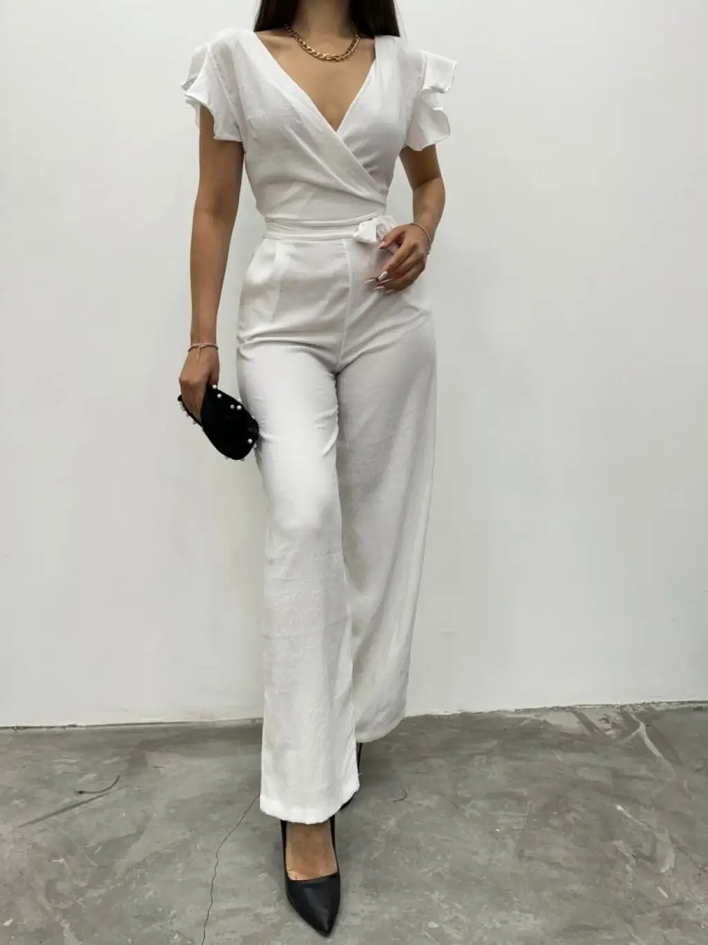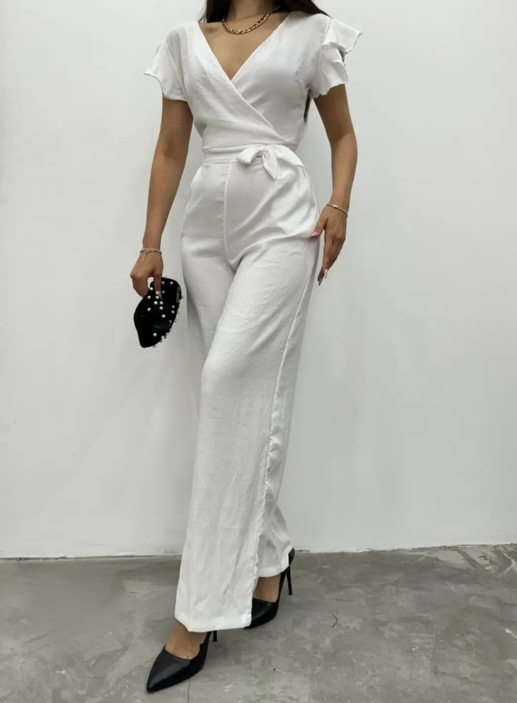 Fermuar Detaylı Fırfırlı Tulum -Beyaz