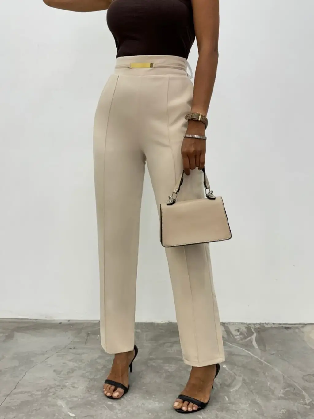 Beli Lastikli Cepli Metal Detaylı Pantolon -Bej