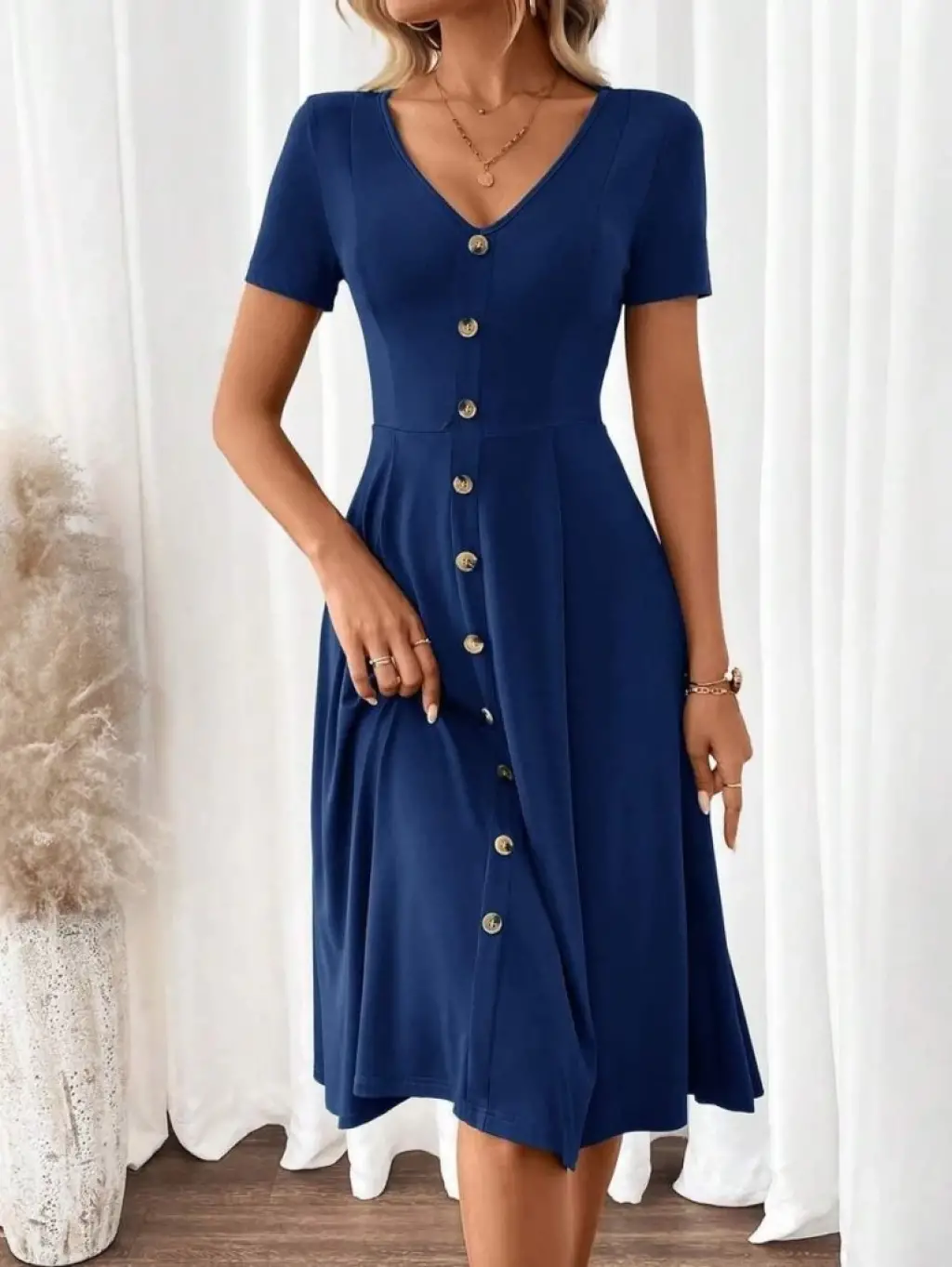 Kadın Kısa Kollu V Yakalı önden Düğmeli A Kesim Dokuma Elbise
